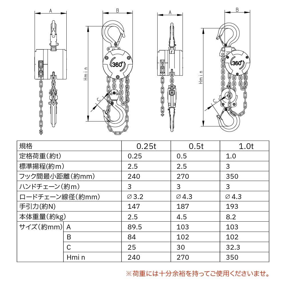●360度対応だからこそ確保できる安全性 引っ張るハンドチェーンは360度回転させることができ、横引き 斜め引きにも対応。 高所や危険場所から離れて作業することができ、安全確保の一助となります。 ●高品質ロードチェーンの採用 吊り上げ用ロードチェーンは国際基準ISOの規定をクリアしたグレード100を採用。 雨や荷重、衝撃などあらゆる外的要因に強い耐久性のある特殊鋼ロードチェーンです。 ●耐久性、耐腐食性に優れたハンドチェーンです。