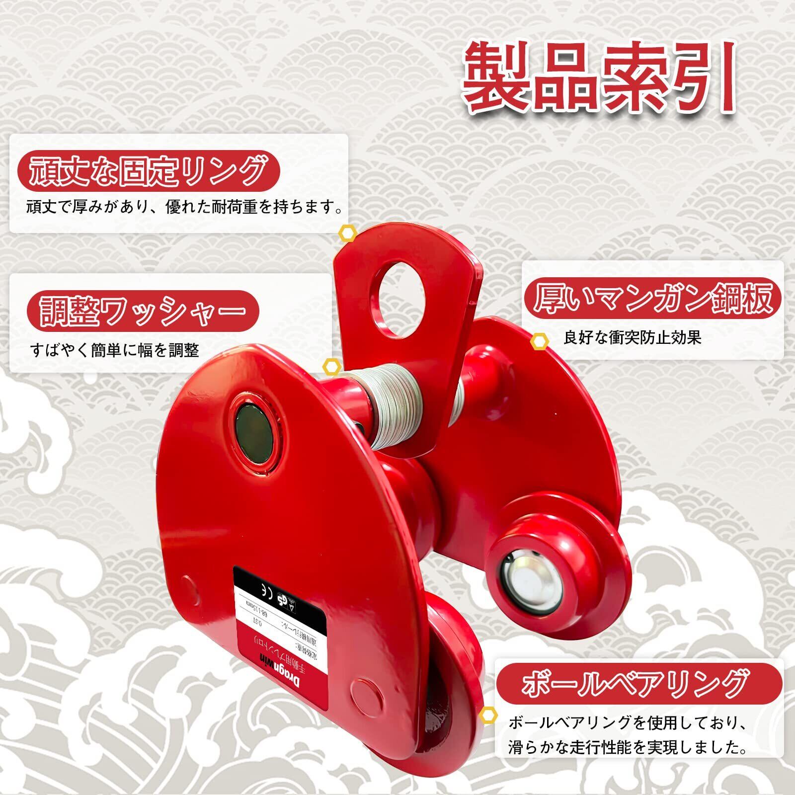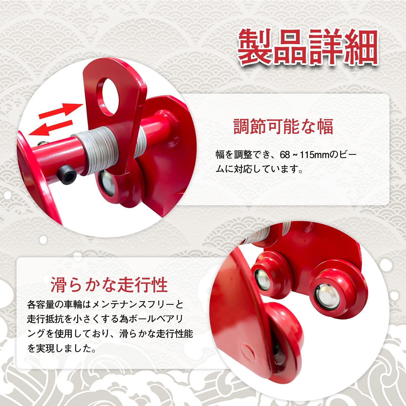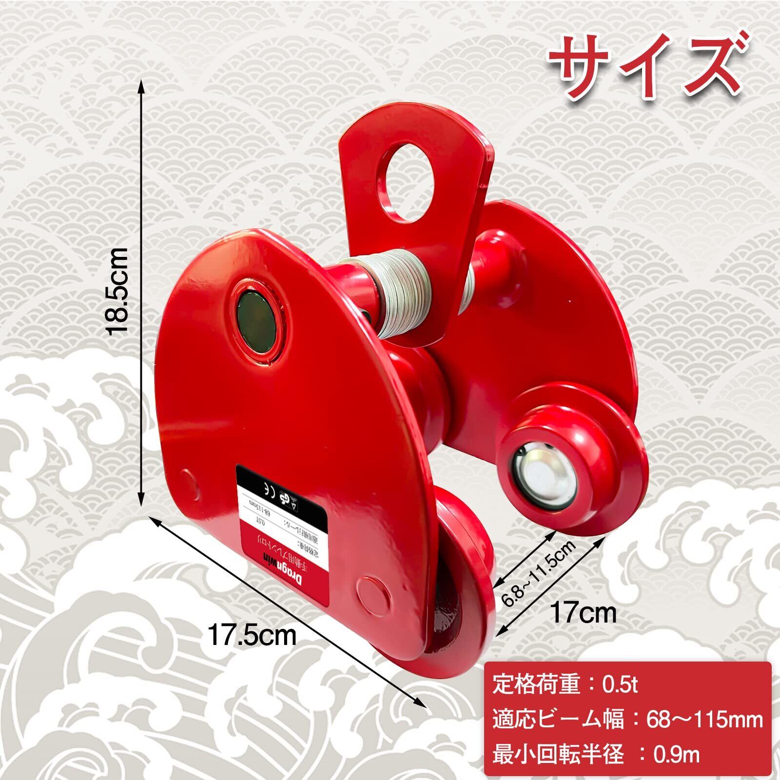 【サイズ】定格荷重:0.5t 適応ビーム幅:68~115mm 最小回転半径 :0.9m