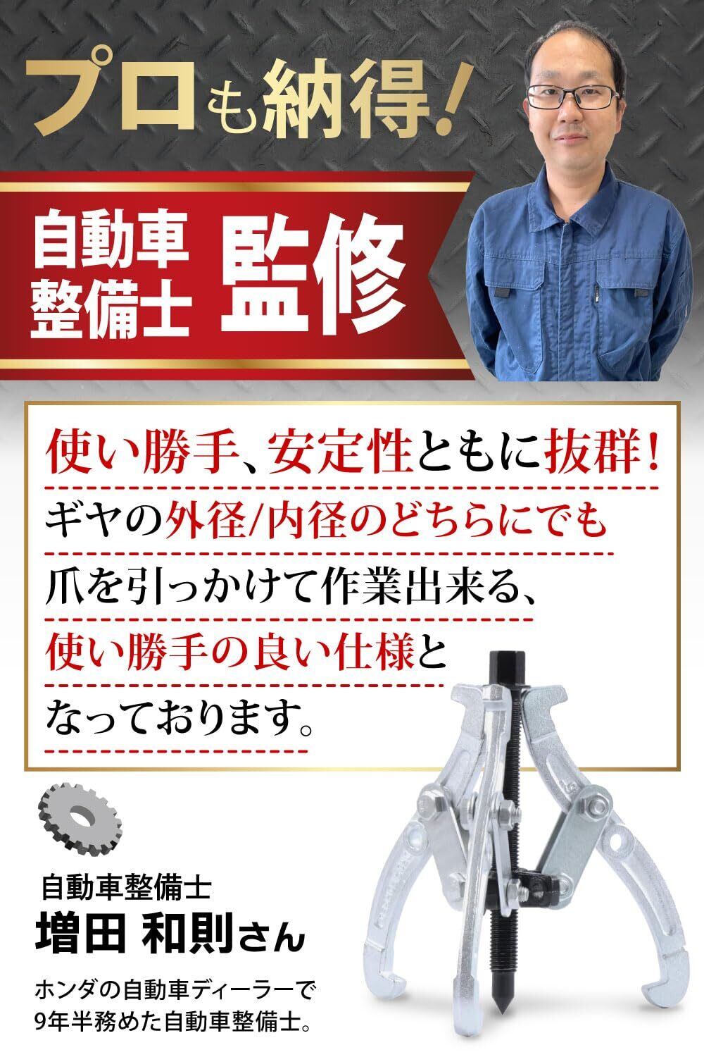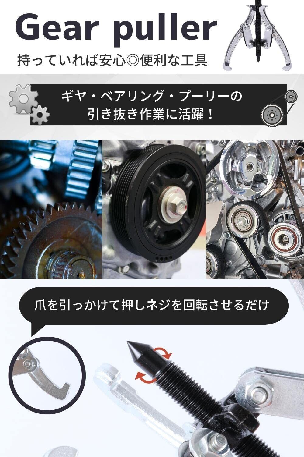 【持っていれば安心◎便利な工具】 ギヤ・ベアリング・プーリーの引き抜き作業に使用する便利な工具です。ギヤ・ベアリング・プーリーを爪に引っかけて、押しネジを回転させると、シャフトに入ったベアリングが抜けるような構造になっています。簡単に外しやすいので万が一の際に、これ一つ持っていると安心です◎