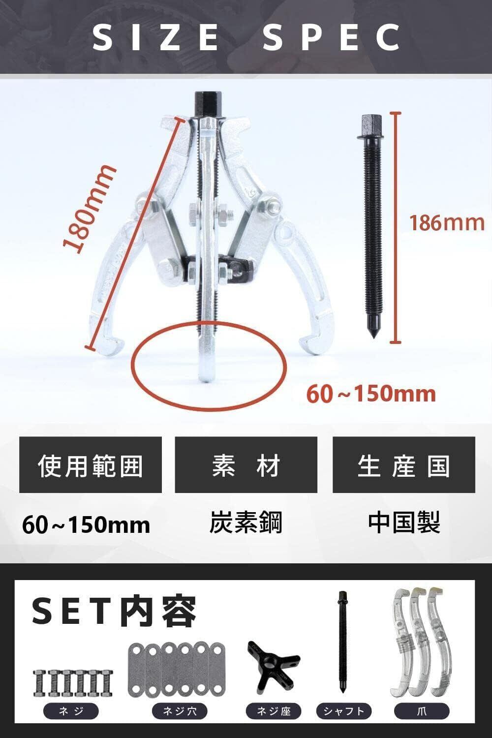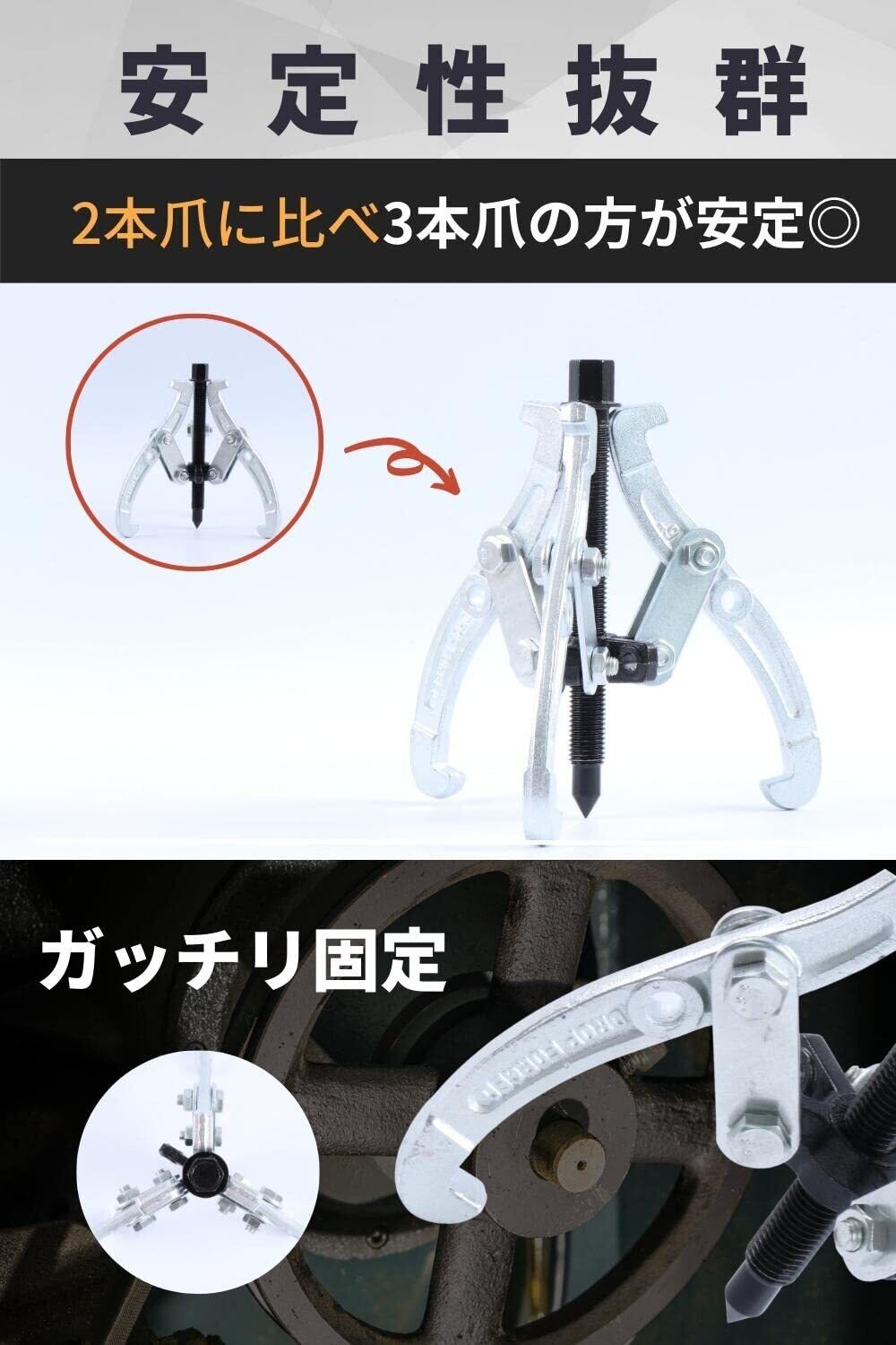 【 安定性 】 2本爪に比べて、3本爪の方がベアリング等を引っかけるときに安定しており作業性に優れています。【 商品仕様 】●「素材」炭素鋼 ●「サイズ」画像にてご確認ください ●「生産国」中国製 ●「使用範囲」0~150mm
