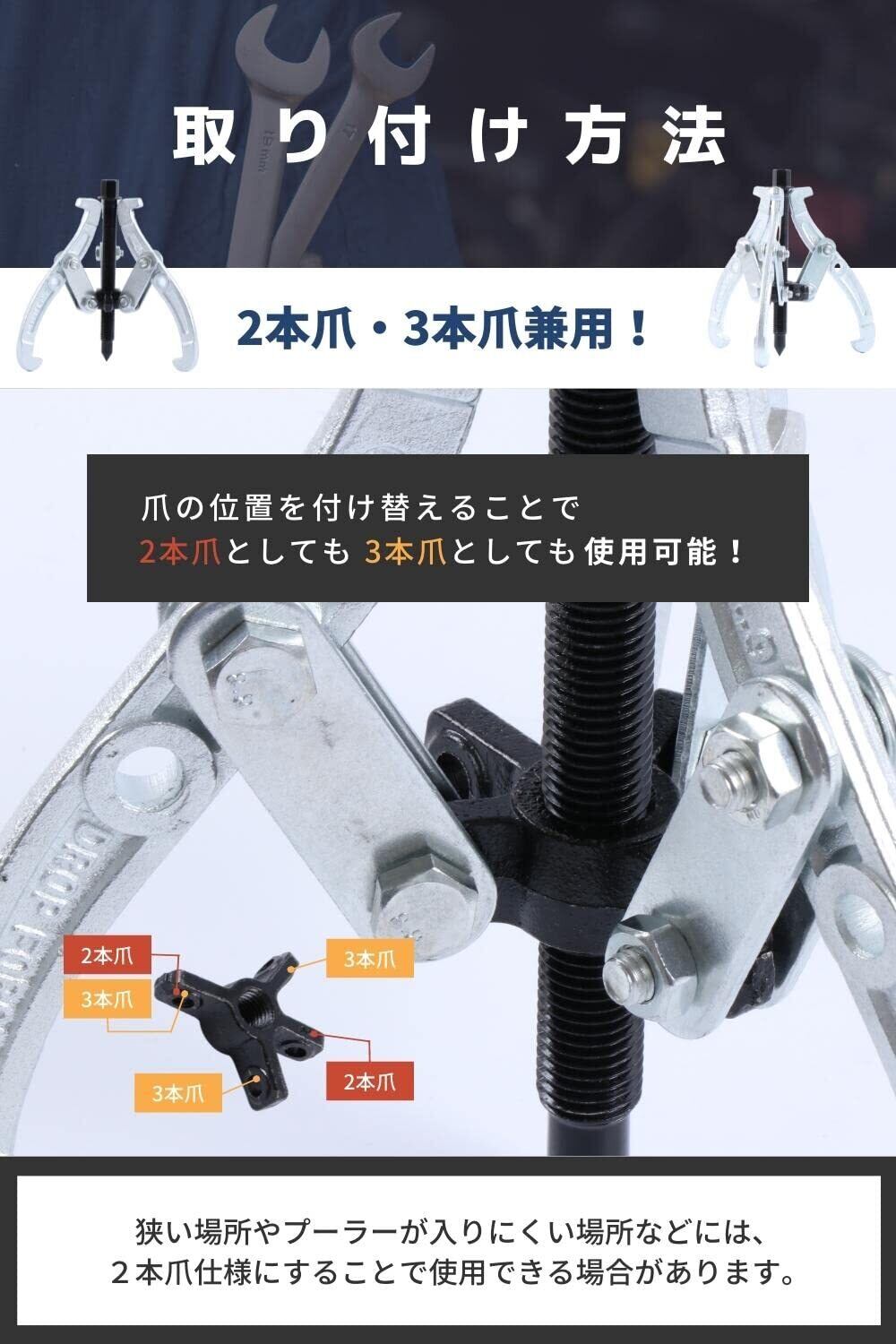 【 取り付けについて 】 狭い場所やプーラーが入りにくい場所などには、2本爪仕様にすることで使用できる場合があります。 ※取り付け方の詳細については画像にてご確認下さい。