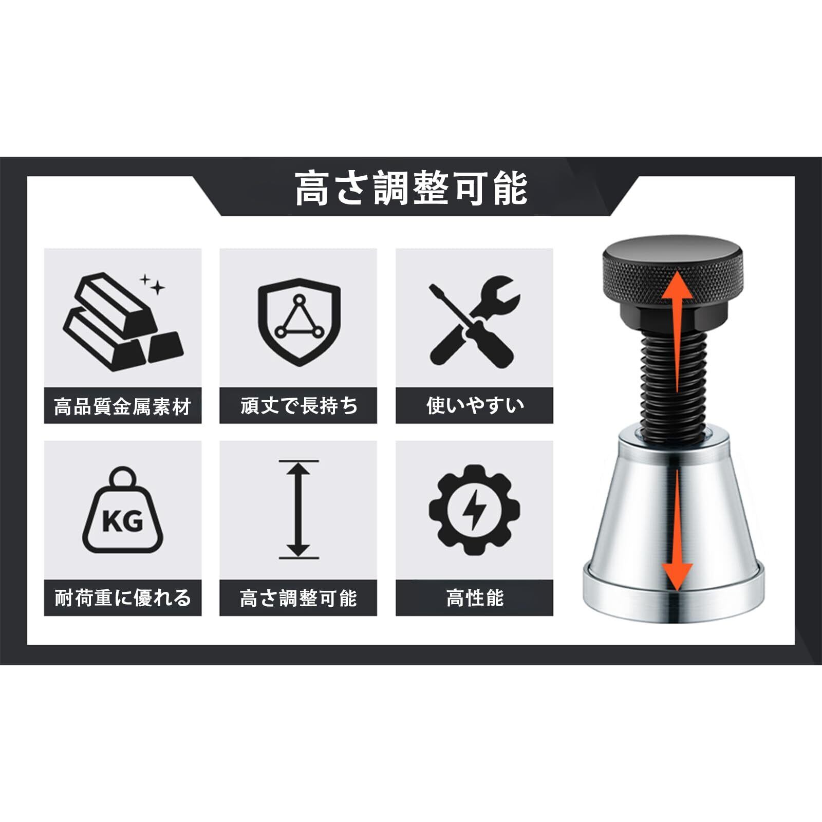 【精密な高さ調整】約67mm(2.63インチ)から102mm(4インチ)まで、微調整可能な広い調整範囲を誇ります。プロジェクトの多様な高さ要件に柔軟に対応し、精密なレベル調整と設置作業を実現します。