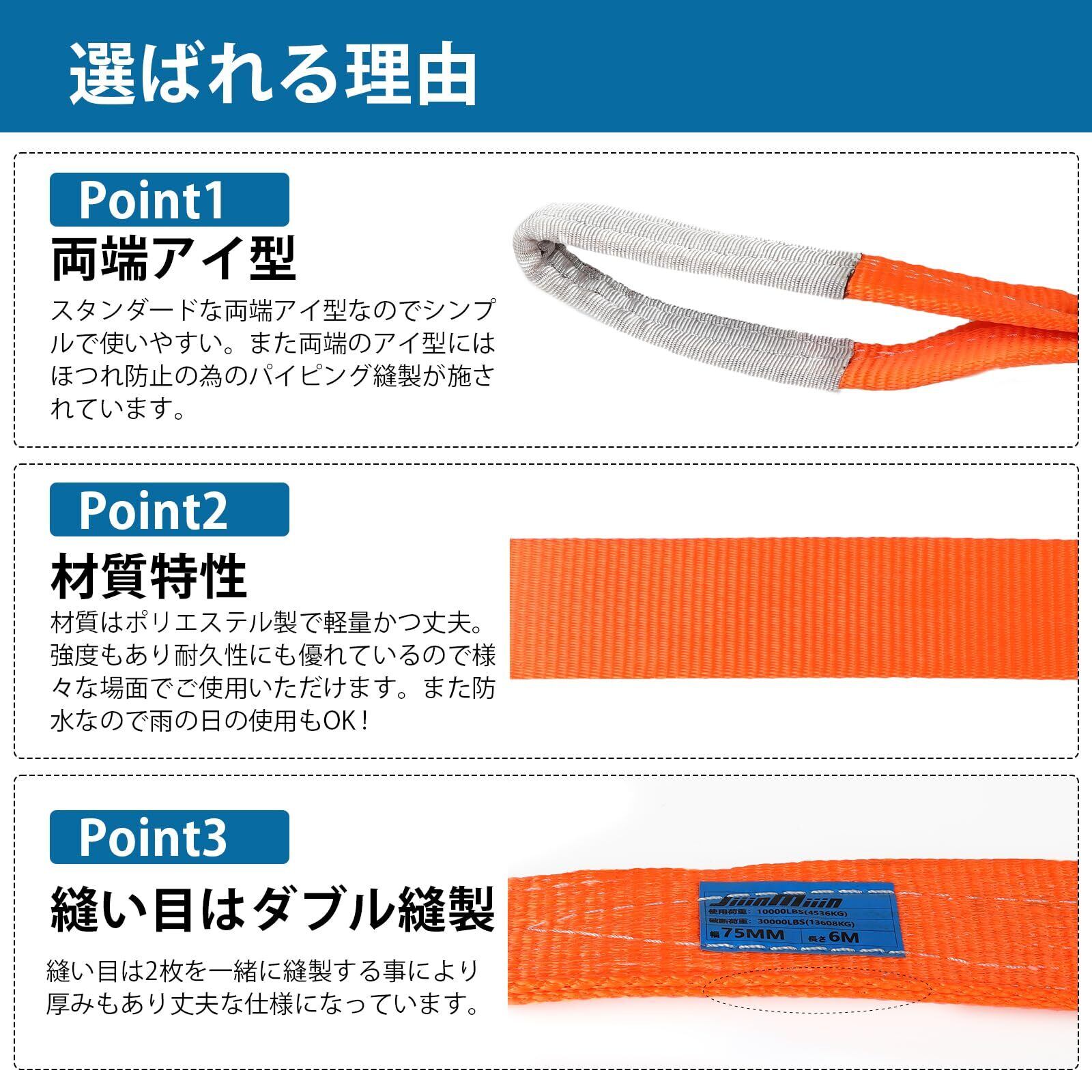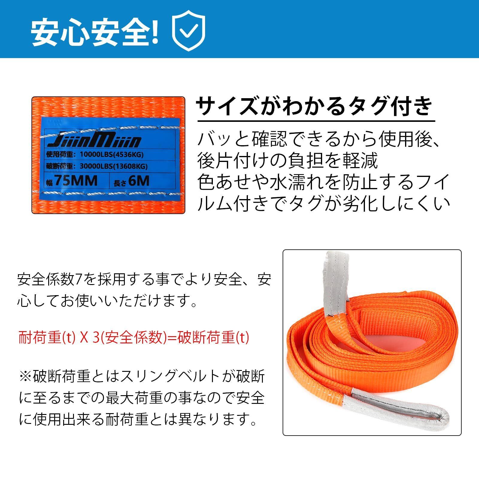 JiiinMiiin スリングベルト 使用荷重10000LBS(4536KG) 長さ6m 幅75mm ポリエステル製 安全ロープ 荷吊りベルト 牽引工具 道具 園芸 出荷 引越し 強度大【2本セット】