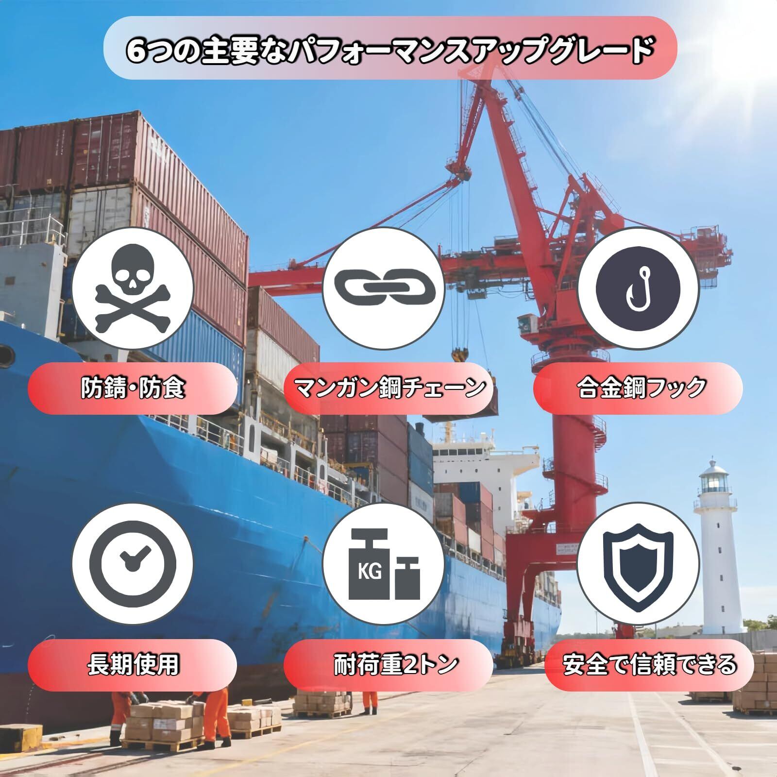 【適用シーン】 機械設置、工場搬送ハンギングチェーン、建築土木、船舶作業に最適。スリングベルトとチェーンフック吊りシステムに対応。