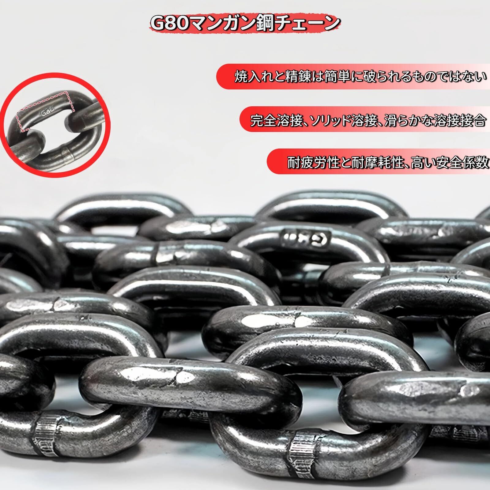 【高靭性・耐磨耗性】 G80合金鋼材質チェーンは研磨・黒染め処理、亜鉛メッキ表面で耐摩耗性向上。ワイヤーチェーン級の疲労耐性を実現。