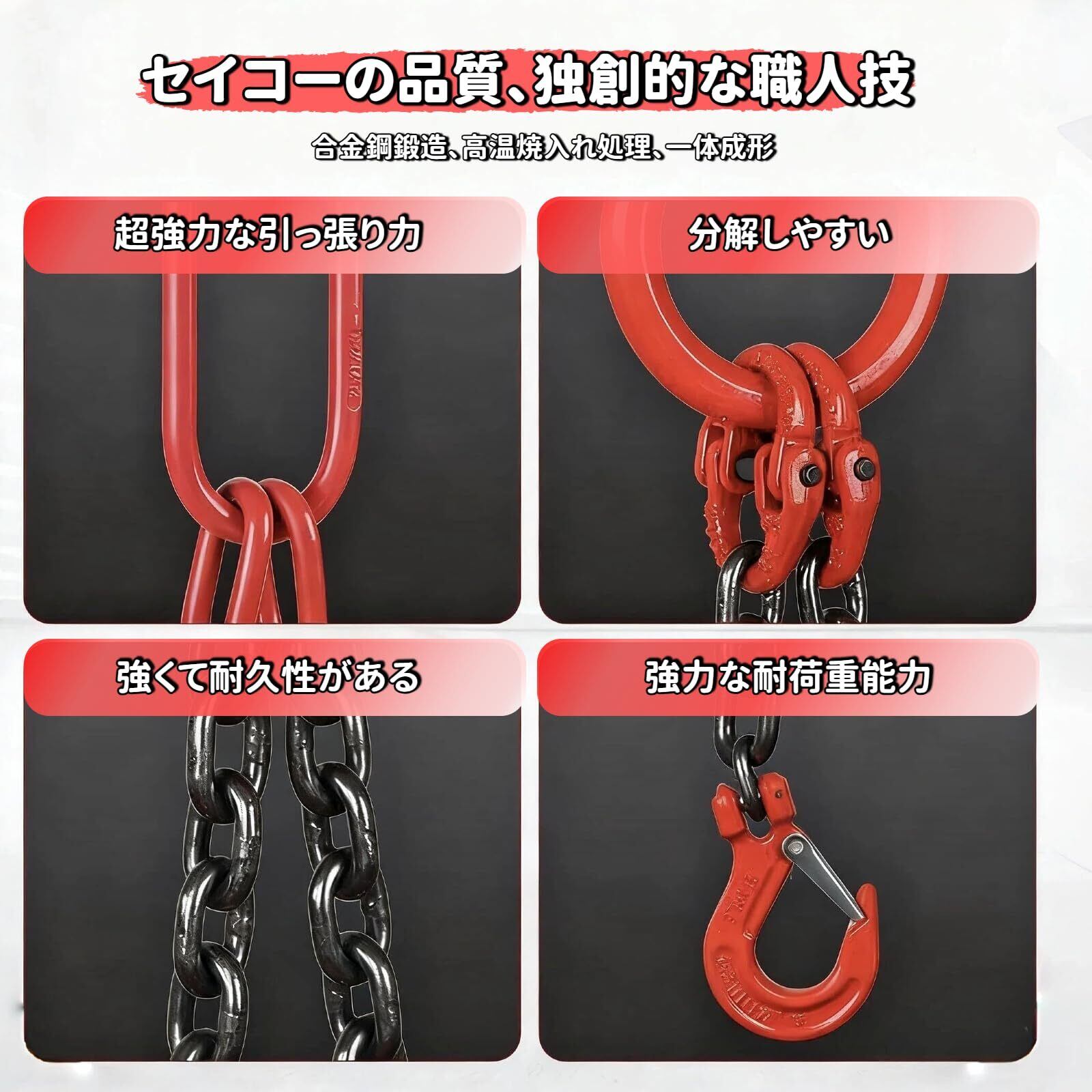 【高強度材料】 マンガン鋼チェーンと合金鋼チェーンフックを採用、変形しにくく耐荷重性に優れ、ハンギングチェーン構造で堅牢耐用。