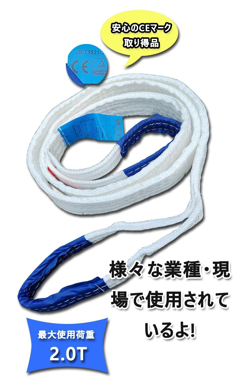 【両端アイ形ベルト】最大使用荷重:2000kg (ストレート吊の場合) 全長:3m ベルト幅:50mm 材質:ポリプロピレン
