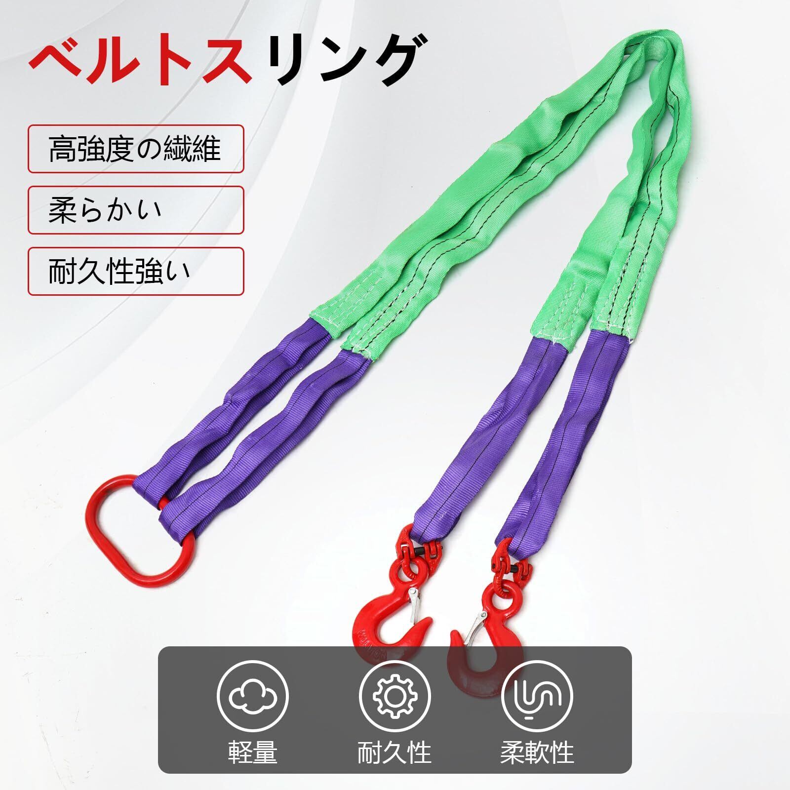 優れた耐候性・耐久性:ベルトはポリエステル を採用、チェーンスリングよりも軽く、取り回しも容易。ワイヤーロープのようにキンクせず、錆びることなく耐久性がある。ソフトな素材は怪我の恐れも低減