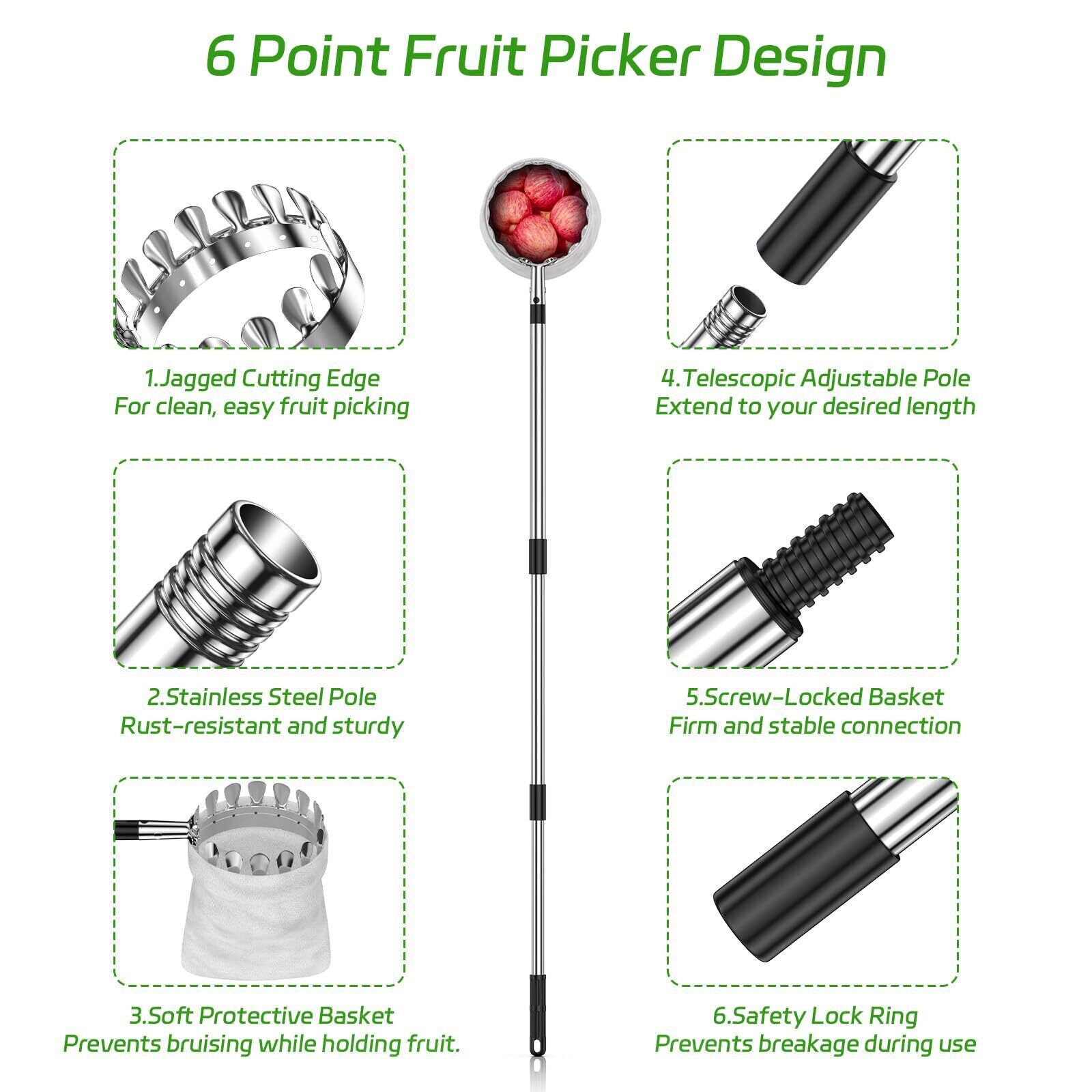 背の高い木から果物を収穫するのがこれまでになく簡単に、または安全になりました。 裏庭の庭、家族の果樹園、農場のいずれであっても、13.8フィートの延長可能なフルーツピッカーツールは、効率的で損傷のない果物狩りの完璧な仲間です。