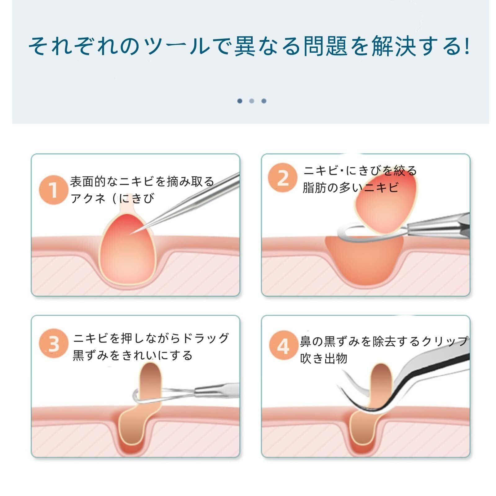 【超微細専門ツール】:毛穴のゴミ除去、ブラックヘッド、脂肪粒の除去、日常使い、DIY、精密作業のために特化したツールです。超微細な先端は露出した汚れを捉えることができます。にきびが真皮の深層に隠れていても、鋭い先端はにきびを突き破り、毛穴の汚れを取り除きます。