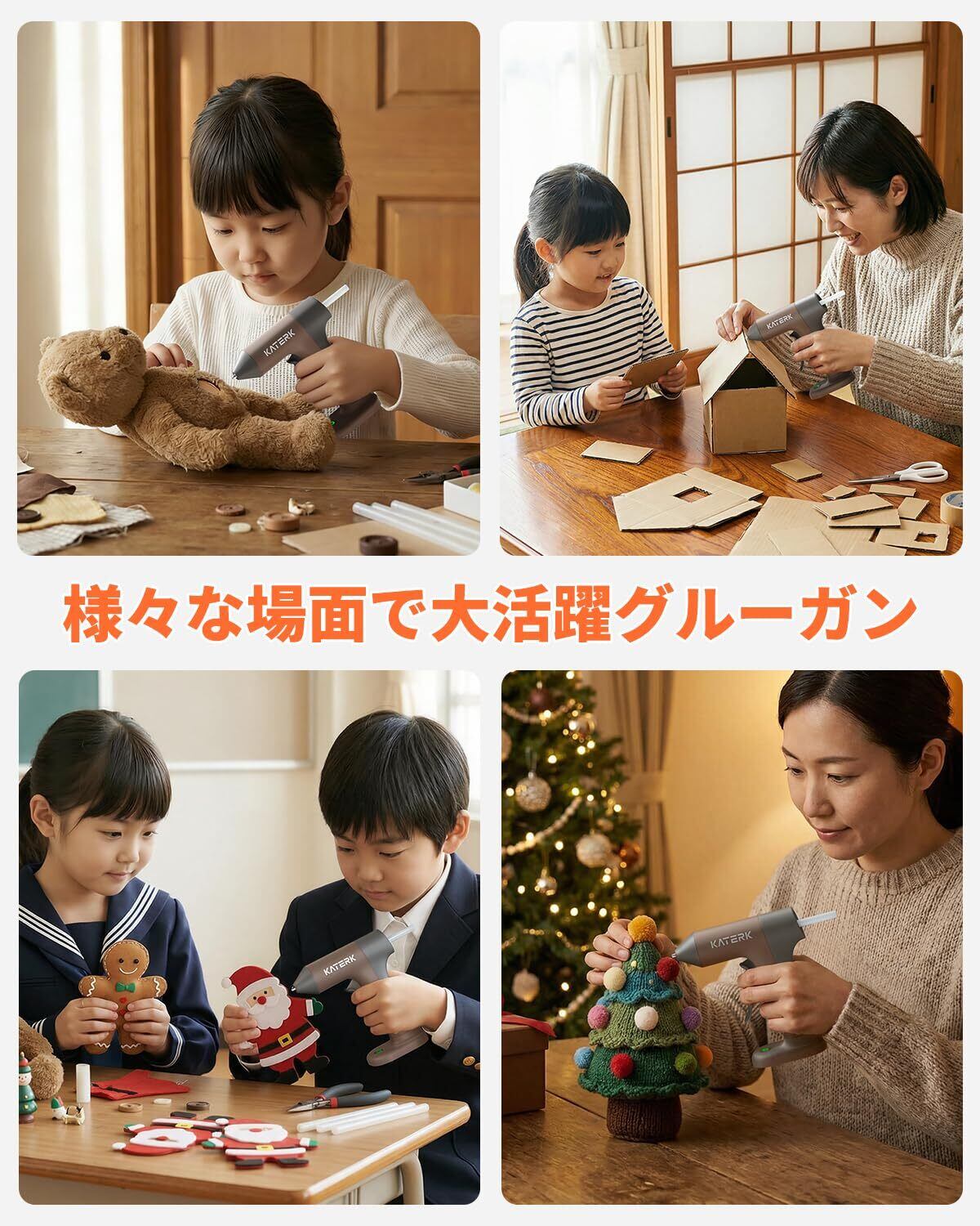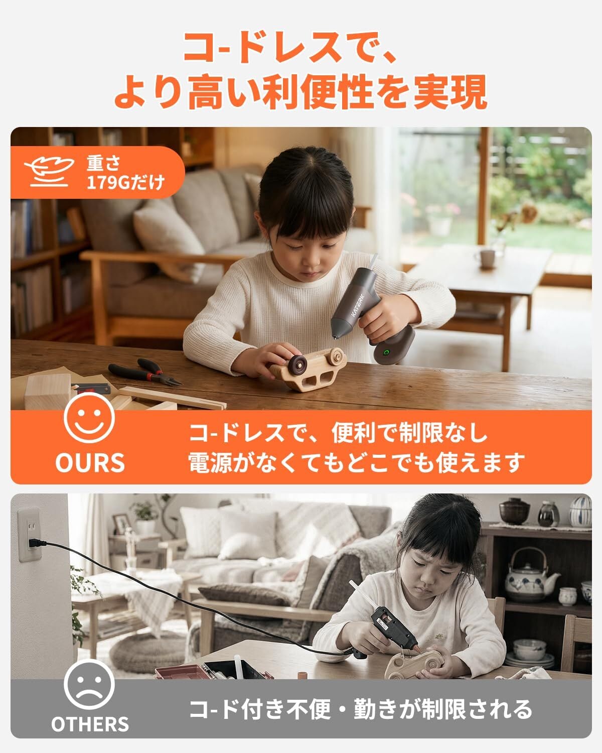 1️⃣ コードレスで創造力無限:コードの短さやコンセント不足で作業が制限された経験はありませんか?このコンパクトなコードレスグルーガンなら、どこでも自由にDIYや手芸、装飾作業が可能。コードレスで、家族や友達と一緒にクリエイティブな時間を楽しめます。