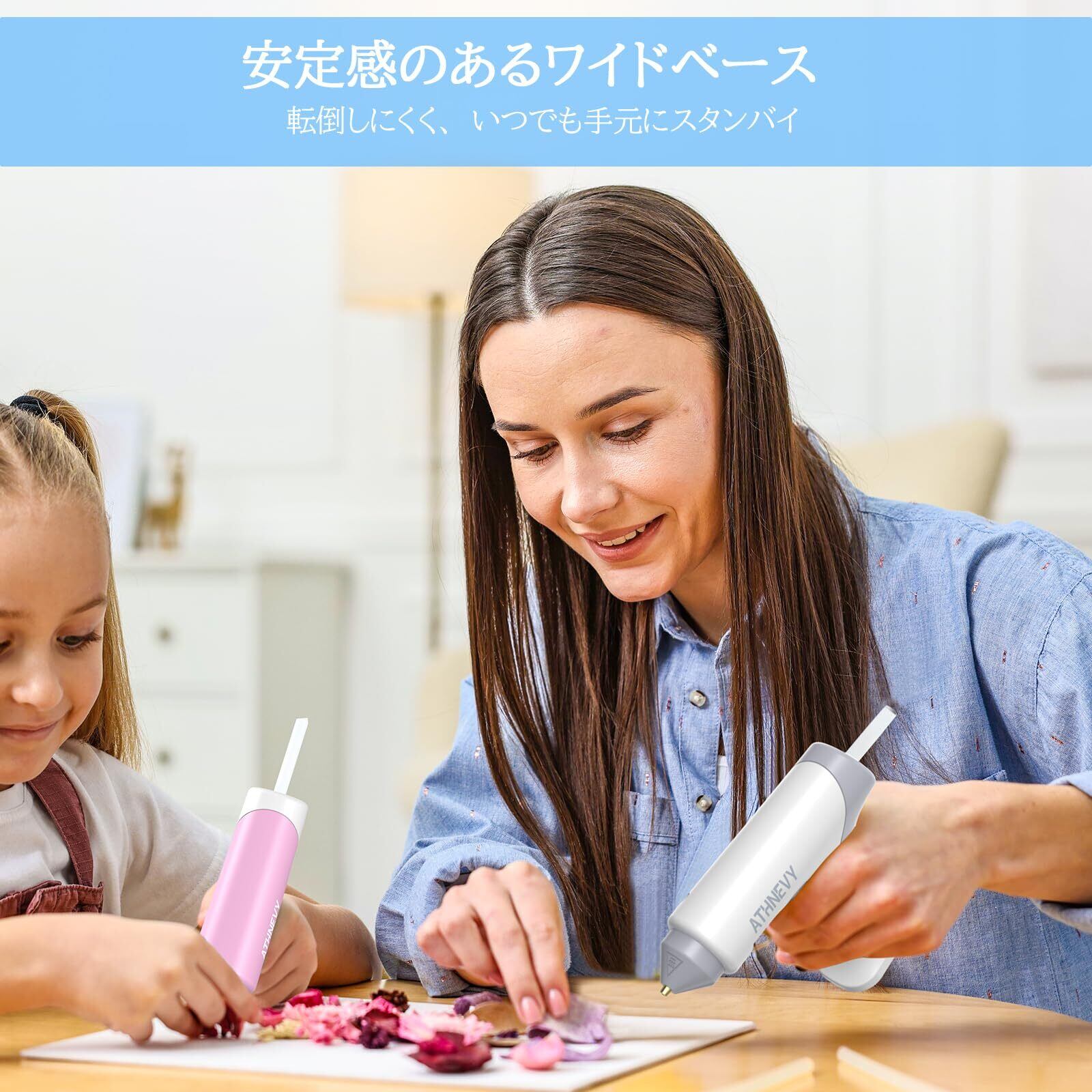 【安定スタンド付き&充実のスターターキット】補強された幅広のスタンドがしっかり固定され、倒れにくく作業中も安心です。エコ素材の7mm×100mmグルースティック30本とUSB-C充電ケーブルが付属し、届いたその日からクラフトや修理にすぐに使えます。