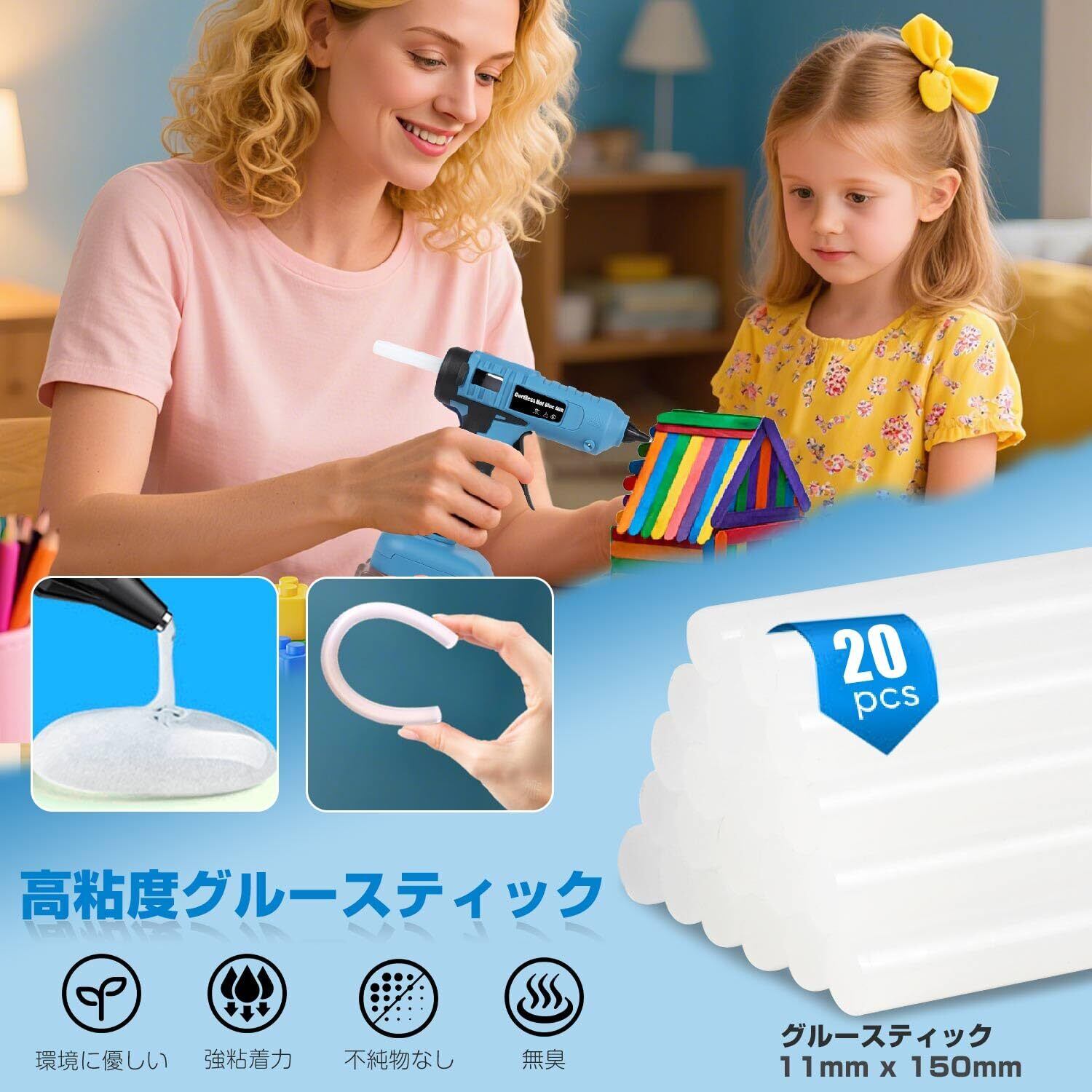 【幅広い用途】高品質なグルースティック(11mm×150mm)を20本同梱。強力な接着力を持ち、環境にやさしく無臭で、接着面にグルー跡が残りません。11mm径の汎用グルースティックに対応しており、多様な用途に活躍します。金属、木材、紙、繊維、皮革、プラスチック、セラミックなど、さまざまな素材に対応可能。クラフトメイキング、クリエイティブカード、ホリデーデコレーション、部品修理、おもちゃ、接着ツール、家具修理、DIYプロジェクトに使用できます。マキタのバッテリーが使えて屋外でのDIYには便利で良いです。