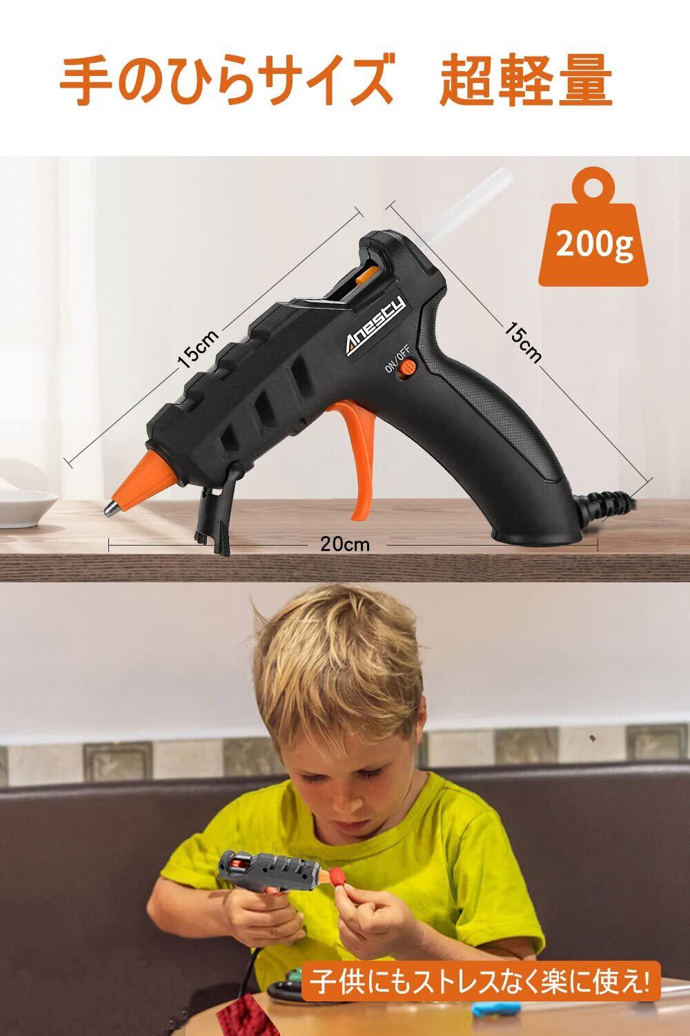 使いやすいデザイン: Anestyグルーガンは、小型で軽量であり、握りやすく、子供でも簡単に使用できます。ノズルは細く、狭い場所でも届けることができ、トリガーでグルーの量を調節できます。スタンドが付属しているため、作業中にグルーガンを置くことができます。