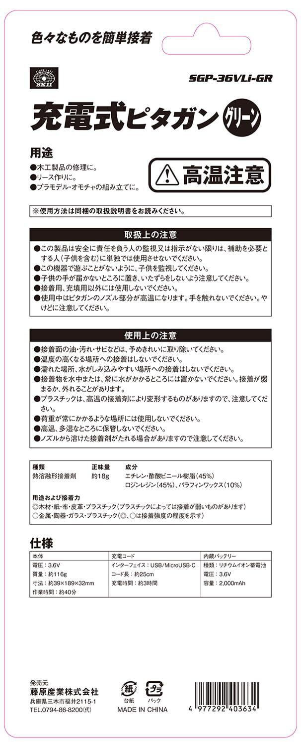 SK11(エスケー11) 充電式ピタガン 3.6V グリーン SGP-36VLi-GR バッテリー容量2000mAh 充電時間約3時間で約40分の作業が可能