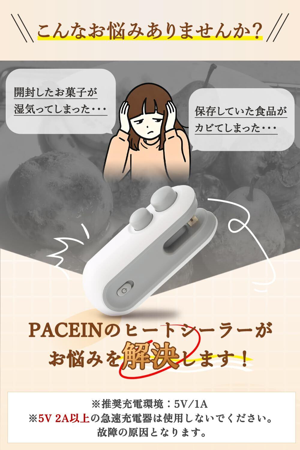 PACEIN ヒートシーラー シーラー家庭用 シーラーハンディ ハンディシーラー 小型 ホットシーラー イージーシーラー USB 充電式ヒートシーラー 密封機 カッター マグネット バッグヒートシール お菓子 袋 保存密封 ポータブル キッチン 旅行用