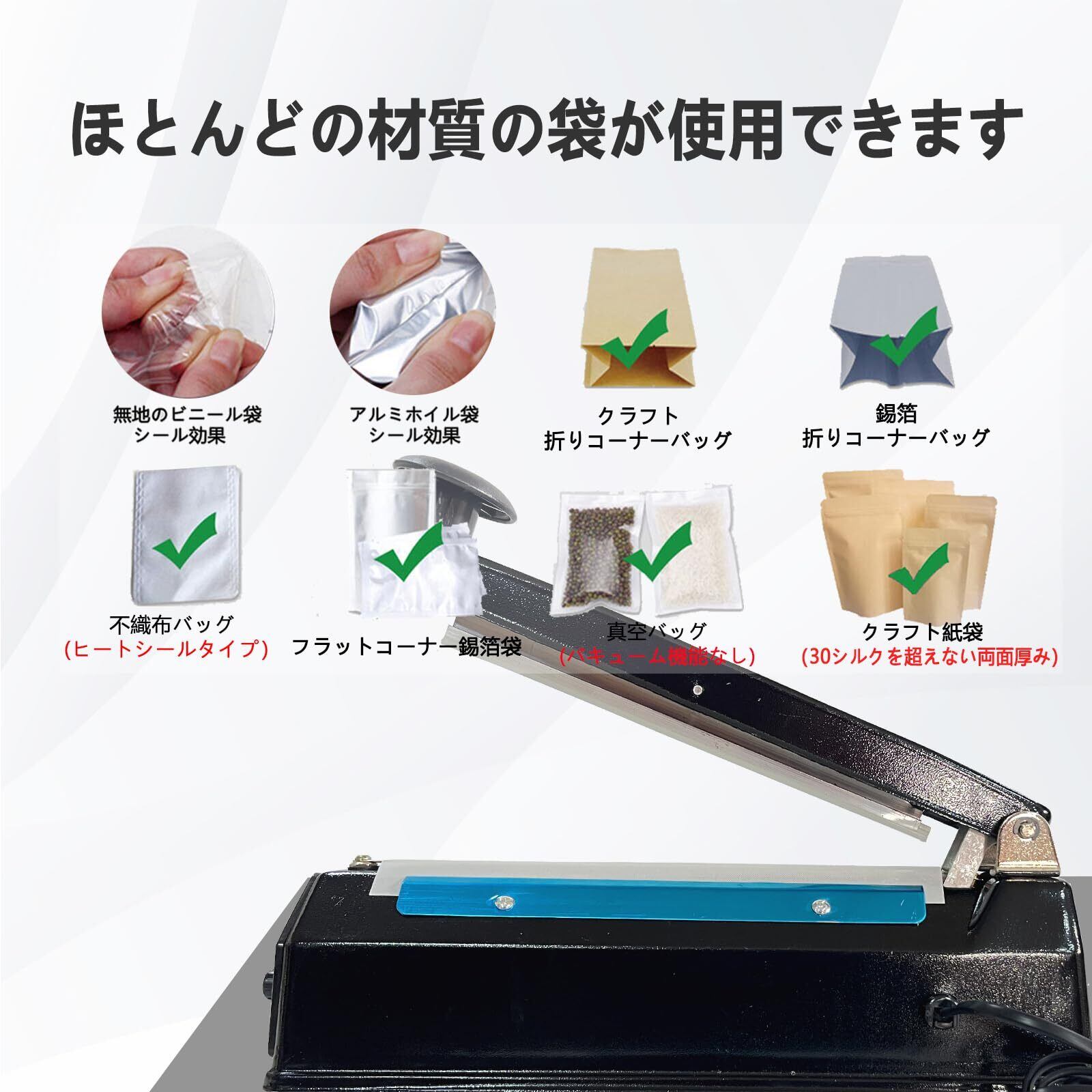 【広いシール幅】広い5MMのシールくぼみは、2MMと3MMのシールくぼみよりも完璧で、より強いシール、シールアプリケーションの広い範囲、毎日のバッグシールのニーズを満たす、家庭と商業用のマシンの完璧な体現者です。