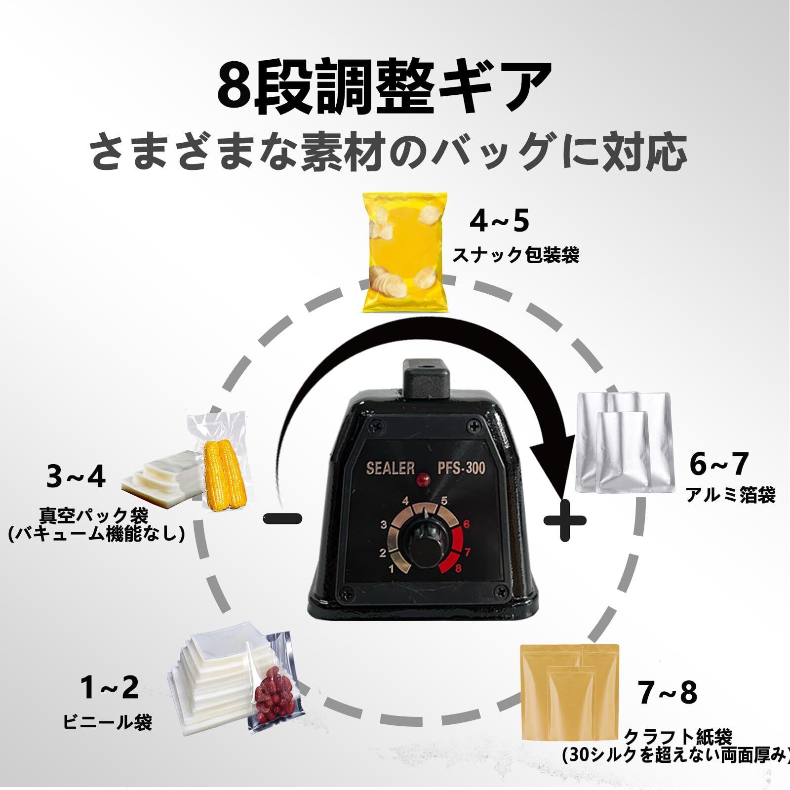 【8調整可能なギア】温度は自由にあなたの好みに合わせて、推奨レベル、ビニール袋:1〜3レベル、クラフト紙袋:4〜5レベル、アルミ箔袋:6〜8レベル、高温シーリング、簡単でトラブルフリー。袋によってシール時間が異なりますので、袋の実際の状況に応じて調整してください。温度が高すぎると袋が溶けてしまい、温度が低すぎるとシールできなくなります。 (必ず専用の密封袋を使用して密封してください)