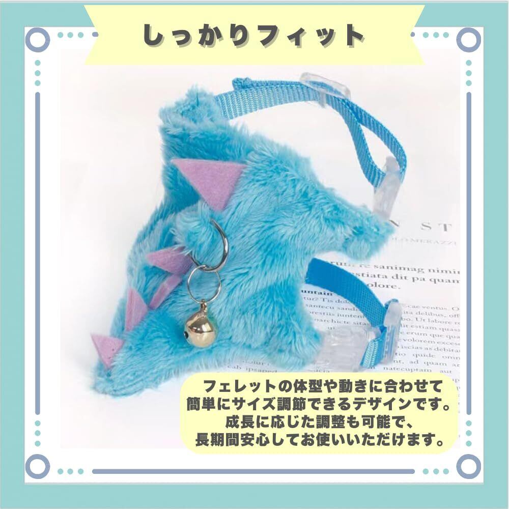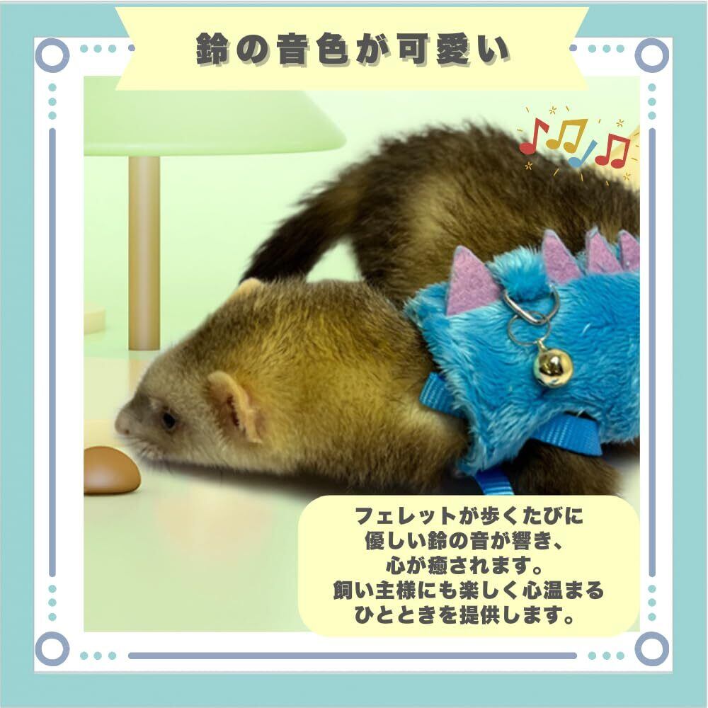 【ユニークなデザイン】恐竜をイメージしたキュートなデザインで、フェレットの魅力をさらに引き立てます。お散歩や写真撮影で、周囲の注目を集めること間違いなし。【調整可能でしっかりフィット】フェレットの体型や動きに合わせて簡単にサイズ調節できるデザインです。 成長に応じた調整も可能で、長期間安心してお使いいただけます。【脱走を防ぐ】丈夫な留め具と調整可能なストラップを採用し、フェレットの脱走やハーネスが外れる心配がなく安心してお使いいただけます。【鈴の音色が可愛い】フェレットが歩くたびに優しい鈴の音が響き、心が癒されます。飼い主様にも楽しく心温まるひとときを提供します。