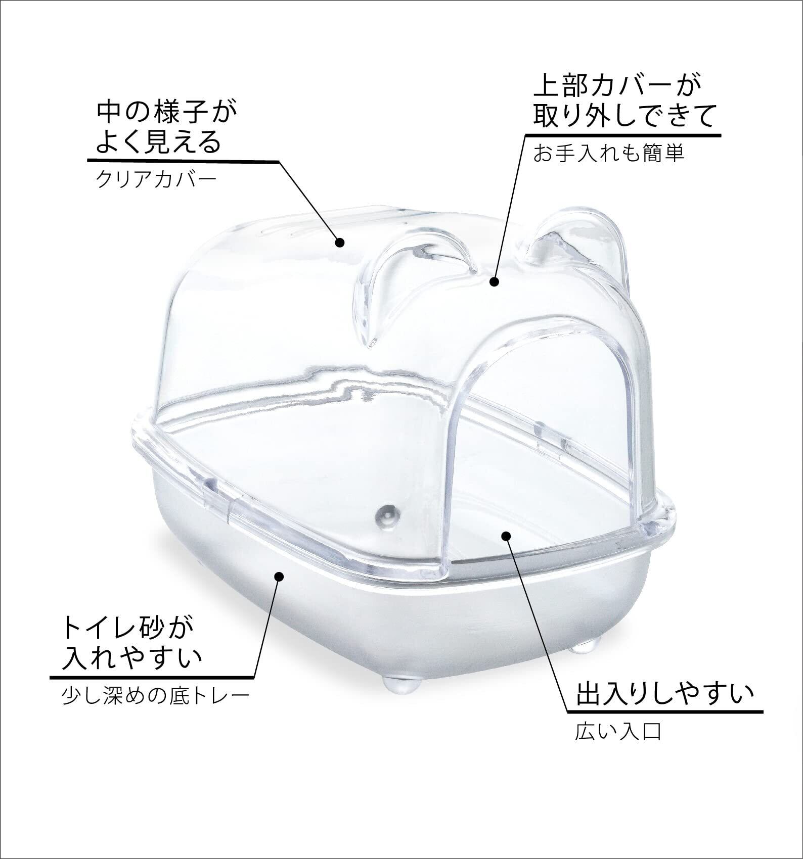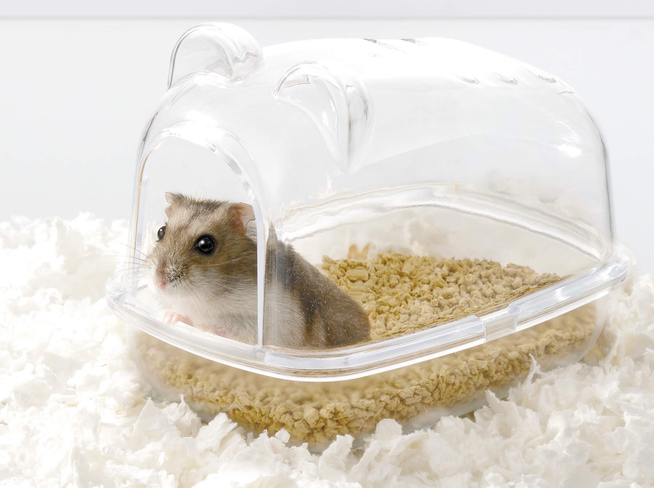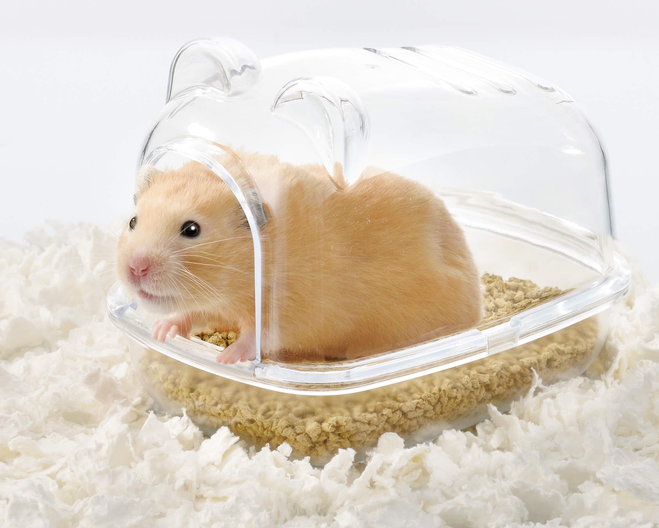 ゆったりサイズで快適空間「ハーモニートイレ」 トイレ砂が入れやすい少し深めの底トレー 中の様子がよく見えるクリアカバー 出入りしやすい広い入口 ハムスター全種対応のゆったりサイズ。上部のクリアカバーが外れるので丸洗いできてお手入れも簡単。 スコップ付き。 ドワーフ用にもお使いいただけます。 ・トレーから上部クリアカバーを外し、ハムスター用トイレ砂(別売)を1~2cmの厚さに入れてください。 製品サイズ(組立時):幅11.0×奥行き15.0×高さ12.0cm