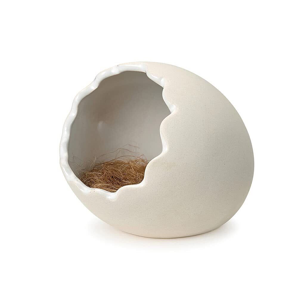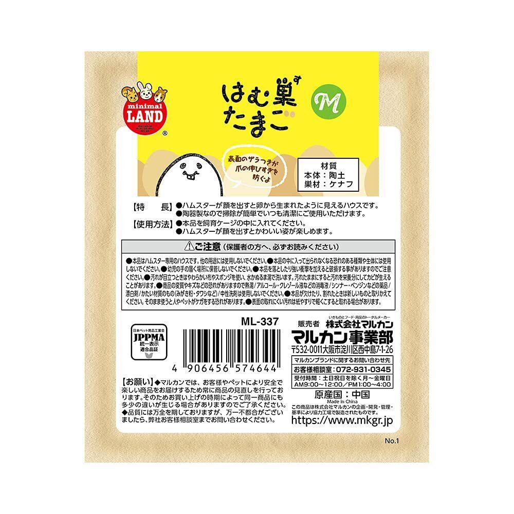 ハムスターが入る事で、まるで卵から生まれたかのような演出が可能な陶器製ハウス。卵の内側は汚れが落としやすいように釉薬コーティング、外側はザラついていて、爪とぎ効果が期待できる仕様。ケナフの巣材が少量付いているのですぐに使う事も可能。ゴーリデンハムスターにぴったりのMサイズ。