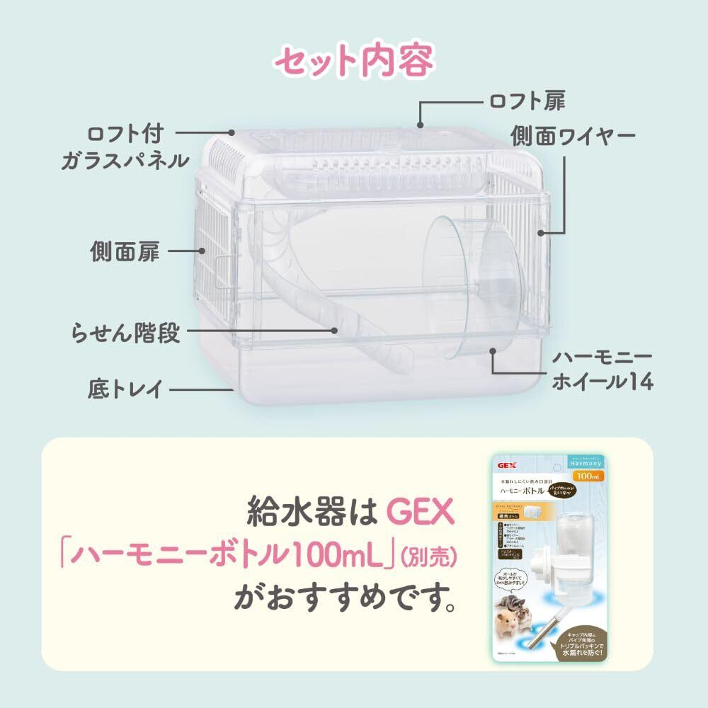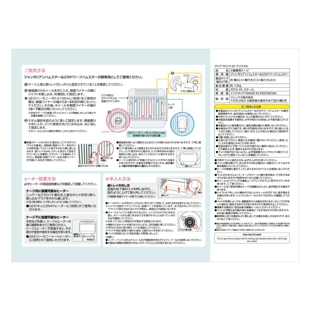 ジャンガリアンハムスターなどのドワーフハムスターの飼育用としてご使用ください。 1.ケージ上部と底トレイがしっかりと固定されていることを確認してください。 2.側面扉からホイールを中に入れ、側面ワイヤーの間にシャフトを差し込み、90度回して固定します。●GEX「ハーモニーボトル100mL」(別売)をご使用の際は、側面ワイヤーの端から3~4本目の間にセットしてください。その後、ホイールを側面ワイヤーの端から6~7番目の間にセットしてください。※床材やケージの底面・ボトルにホイールが接触しないように高さや位置を調整してください。 3.らせん階段の先を差して固定します。側面扉から中に入れ、ロフト底部の丸穴にはめ込み、右に回して固定します。※ホイールとらせん階段の間をしっかりとあけてください。 ●本製品はジャンガリアンハムスターなどのドワーフハムスターの屋内飼育専用です。他の目的には使用しないでください。●ペットが扉を開けてしまうおそれがある場合は、市販のビニタイなどで扉を確実にロックしてください。●ケージの隙間に顔が入ってしまう大きさのペットには使用しないでください。●ペットの大きさによって、ケージやパーツに顔や体を挟み、ケガをするおそれがありますので使用中は十分に注意してください。●ホイールのベアリングの構造上、ベアリングのブレに若干のバラつきがあります。ご了承ください。●ホイールをご使用の際はケージの振動などにより、音が発生する場合があります。●シャフトネジをしっかり締め付けないとホイールがガタつき、音が発生する場合があります。シャフトとホイールにがたつきがないか確認してください。●ペットの性質によっては、樹脂部をかじる場合があります。かじって穴が開いた場合は、脱走のおそれがありますので、目が届く範囲で使用してください。●飼育時における事故などに関しましては責任を負いかねますので、あらかじめご了承ください。