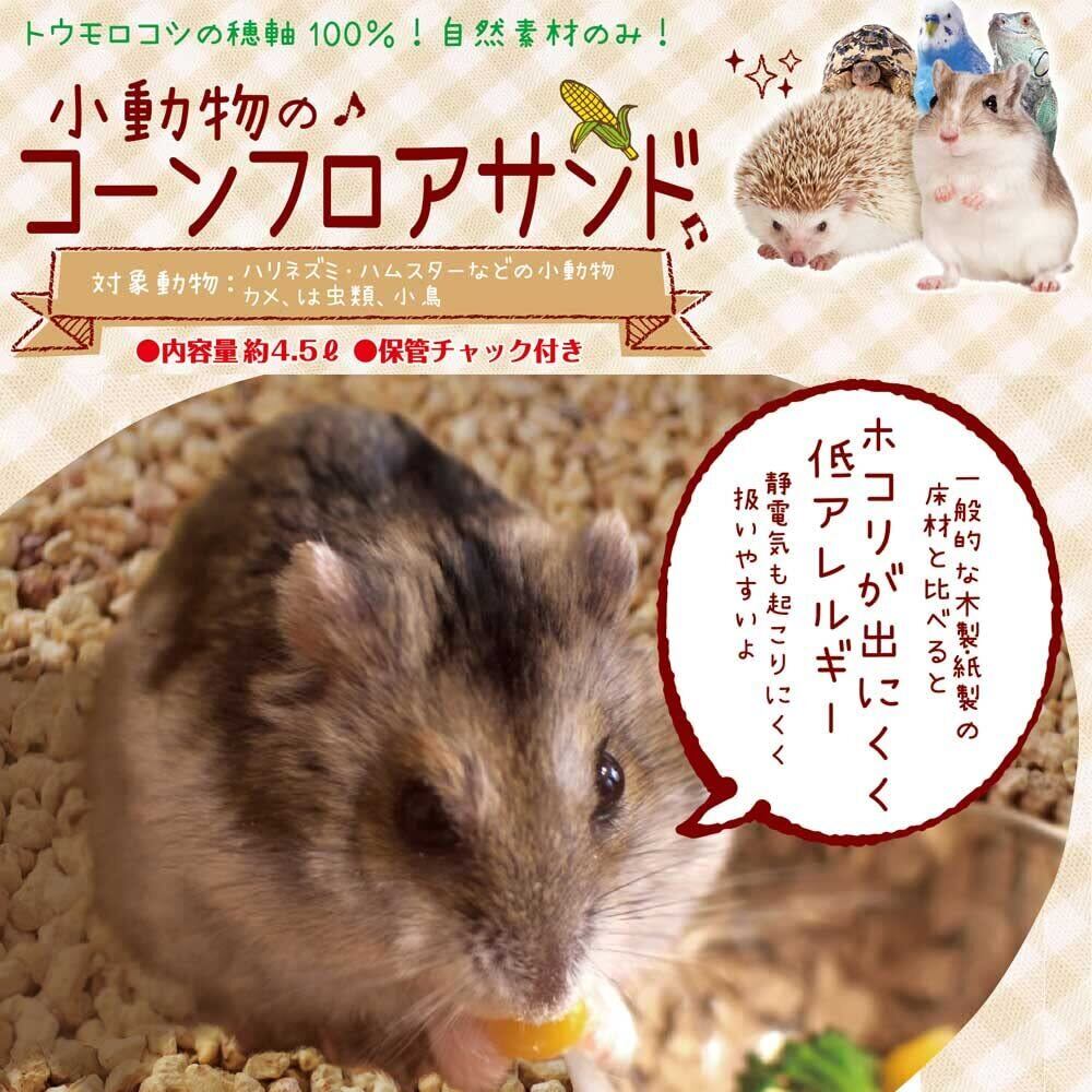 天然素材であるトウモロコシの穂軸のみで作った、小動物専用の床材。消臭性・吸収性・吸湿性にも優れ、夏場もサラッと気持ちよく過ごせる。一般的な木製・紙製の床材と比べるとホコリが出にくく、低アレルギーなので、いろんなペットにおすすめ。保管に便利なチャック付き。