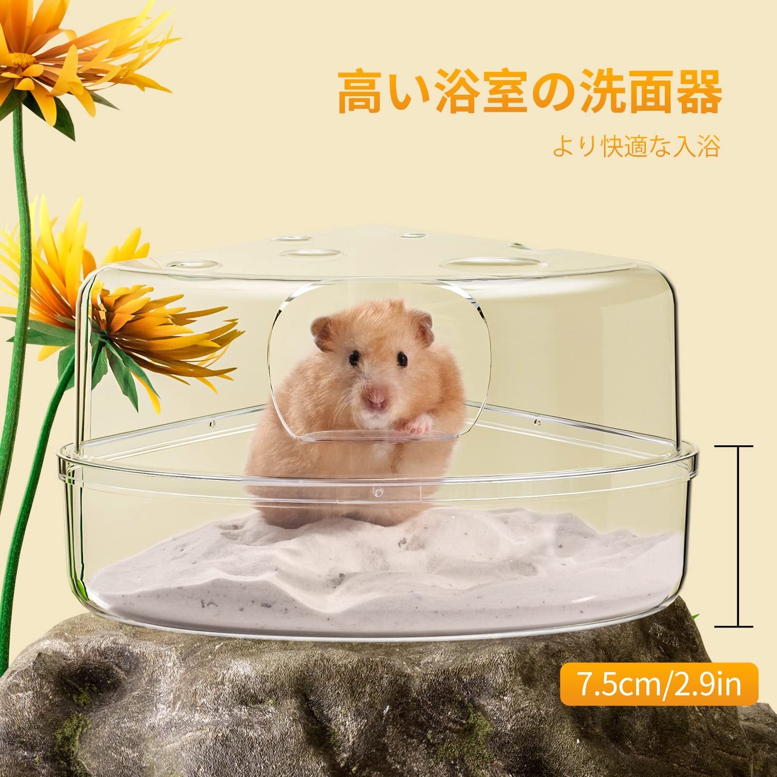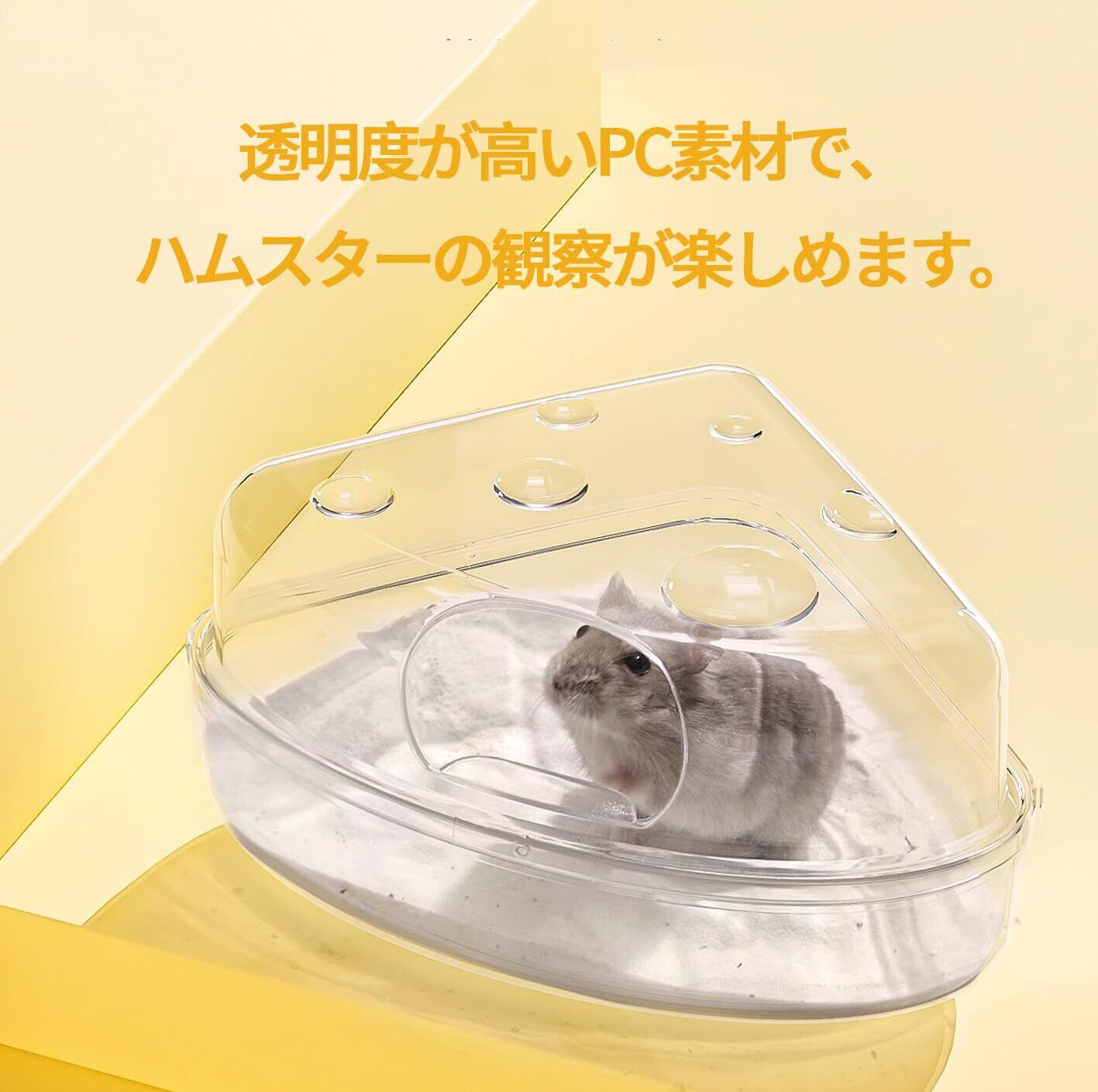 【かわいいチーズのデザイン】三角形のチーズのデザインのトイレで、かわいく面白くしてくれます。全面クリアのトイレで、浴び砂の上を気持ちよさそうに転がるハムスターを心ゆくまで眺めることができます。