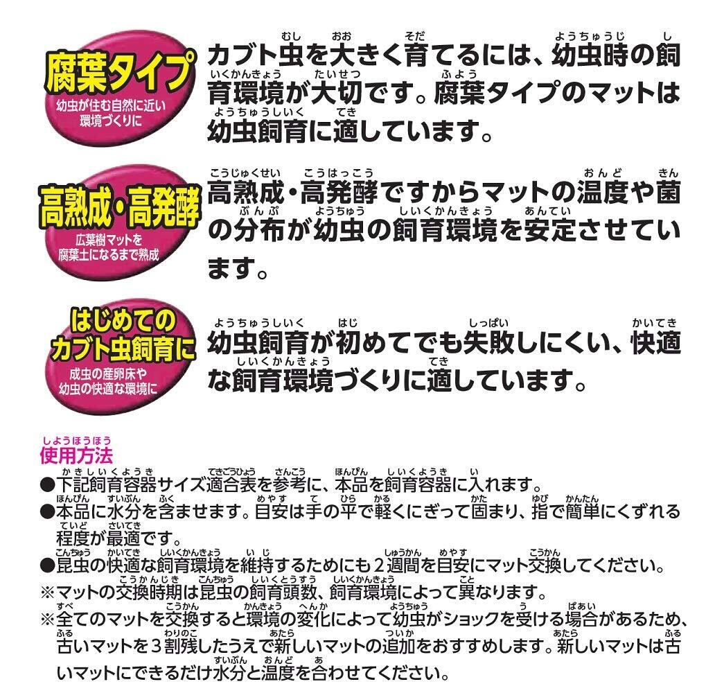 高熟成・高発酵!はじめてのカブト虫飼育に最適!成虫の大きさは幼虫をいかに大きく育てるかで決まります。バイオ育成幼虫マットはカブト虫の幼虫飼育環境に適しています。