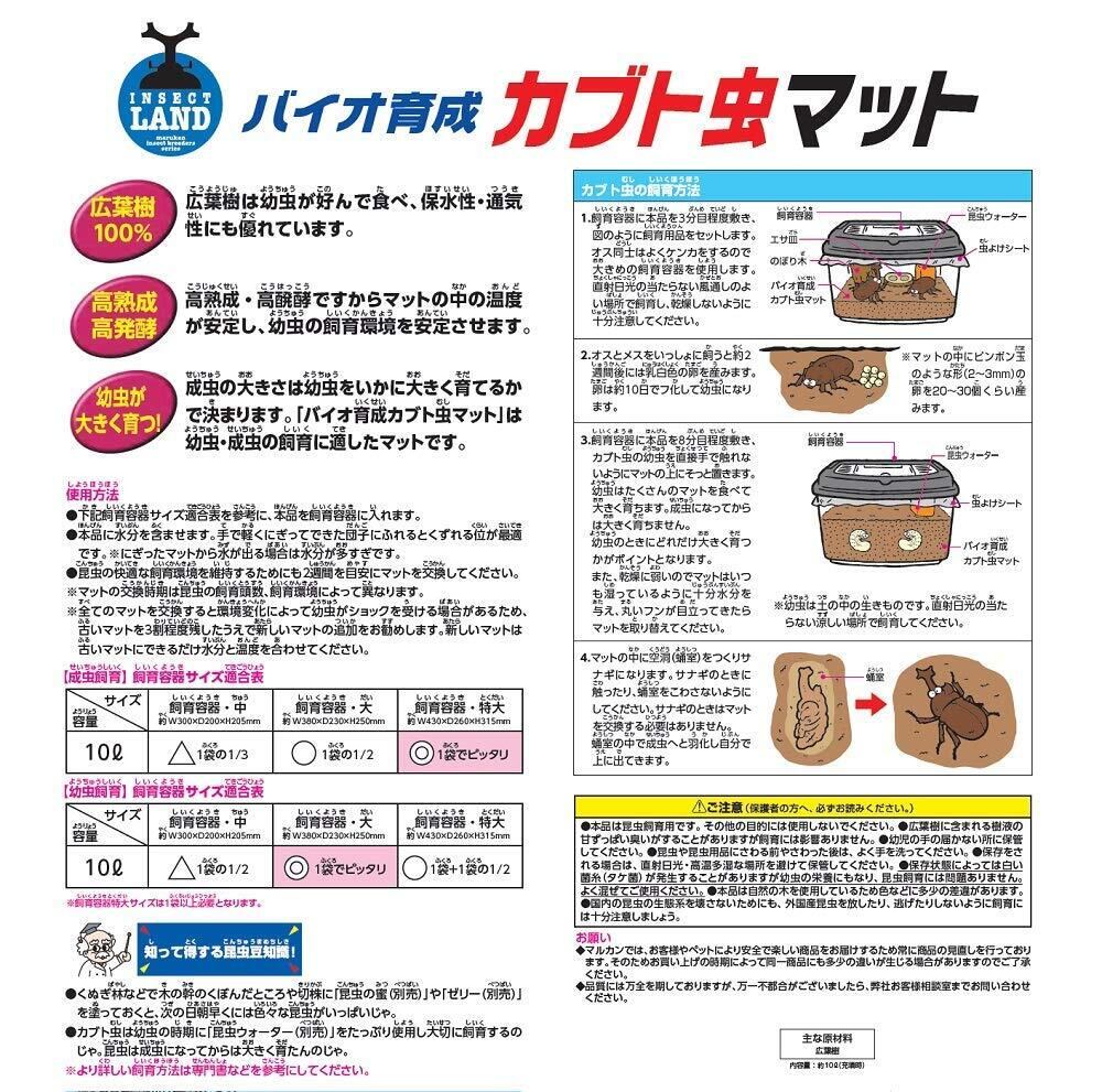 昆虫の快適な飼育環境を維持するためにも2週間を目安にマットを交換してください。マットの交換時期は昆虫の飼育頭数、飼育環境によって異なります。全てのマットを交換すると環境変化によって幼虫がショックを受ける場合があるため、古いマットを3割程度残したうえで新しいマットの追加をお勧めします。新しいマットは古いマットにできるだけ水分と温度を合わせてください。本品は昆虫飼育用です。その他の目的には使用しないでください。商品自体が植物を天然由来で朽ちた植物をさらに発酵させて作られているため、広葉樹に含まれる樹液の甘ずっぱい臭いや排泄物の臭いに近い臭いを感じる場合がありますが、飼育には影響ありません。特に夏季の使い始めは菌が活性化するため、臭いが強くなりやすくなります。そのような場合は、通気性のある場所に保管し水分が多すぎる場合は乾燥させてください。土を掘り返して混ぜる事も有効です。幼児の手の届かない所に保管してください。昆虫や昆虫用品にさわる前やさわった後は、よく手を洗ってください。保存をされる場合は、直射日光・高温多湿な場所を避けて保管してください。保存状態によっては白い菌糸(タケ菌)が発生することがありますが幼虫の栄養にもなり、昆虫飼育には問題ありません。よく混ぜてご使用ください。本品は自然の木を使用しているため色などに多少の差違があります。国内の昆虫の生態系を壊さないためにも、外国産昆虫を放したり、逃げたりしないように飼育には十分注意しましょう。