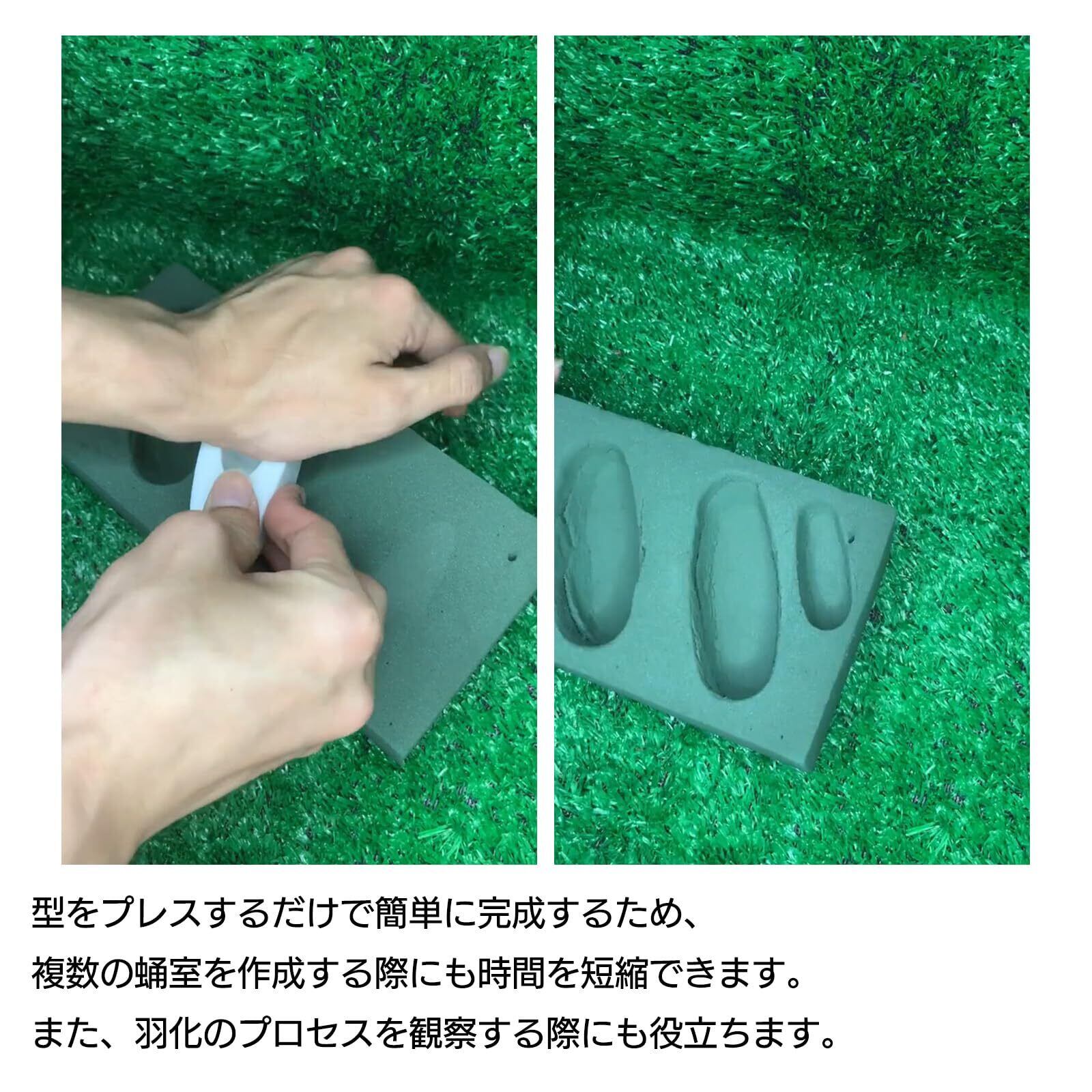 本商品は園芸用のスポンジなどに型をプレスするだけで簡単に蛹室を作成できる設計です。複数の蛹室を短時間で作成することができるため、多くの幼虫を飼育している方にも最適です。また、人工蛹室はカビの発生リスクを軽減し、蛹室の損傷を防ぐことで、安全な成長環境を提供します。