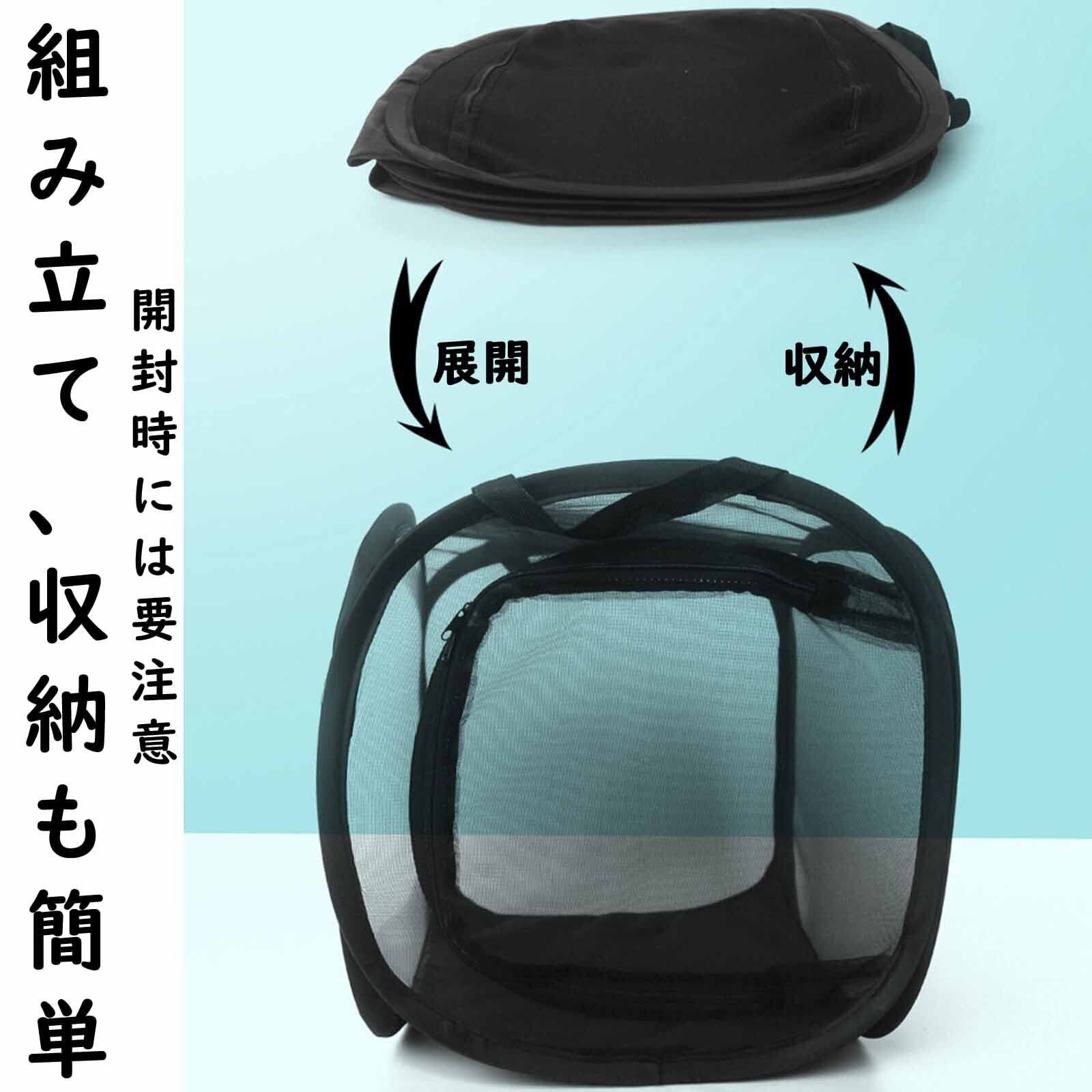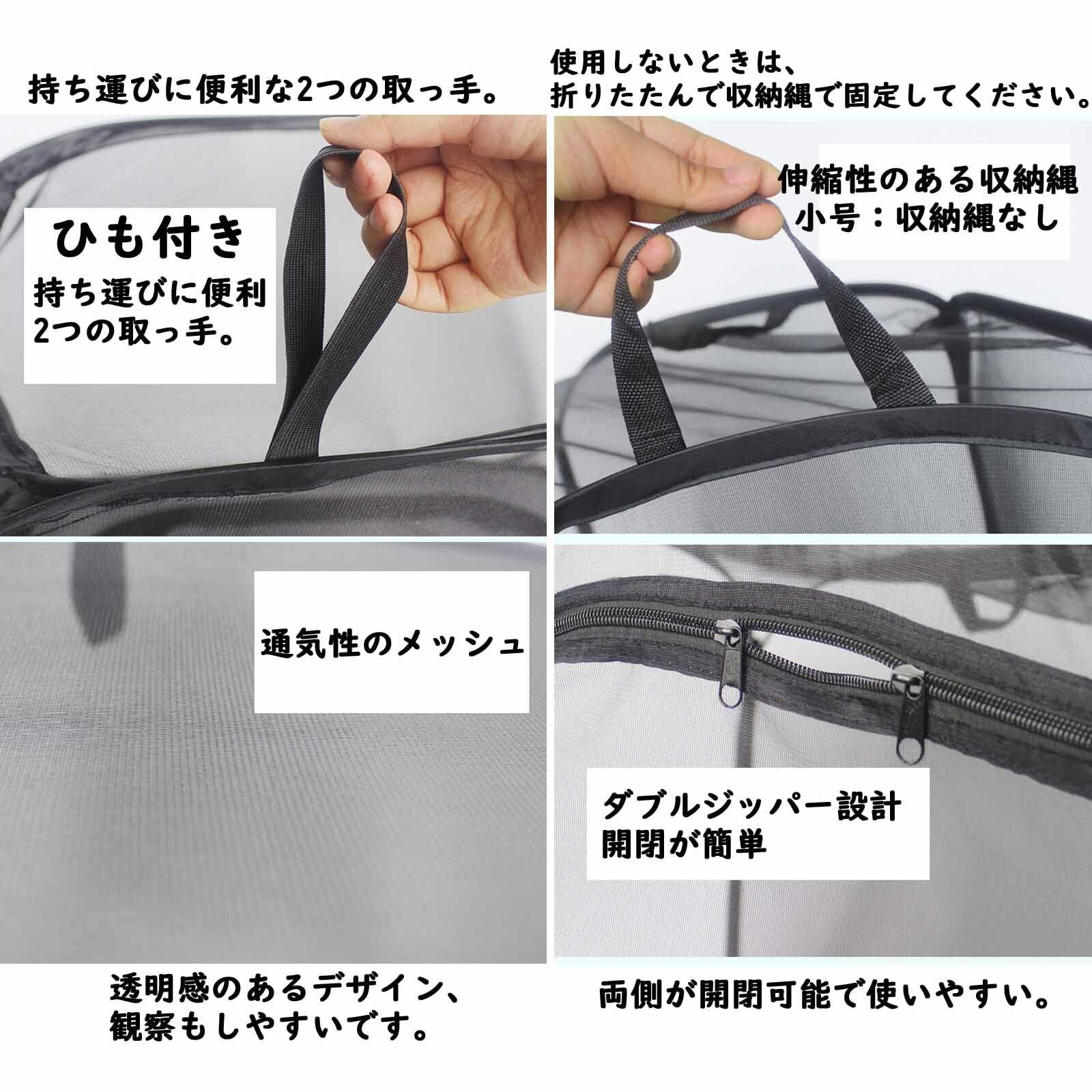 【昆虫ケージメッシュ素材】網タイプの虫かご、風通しのがとても良いので、虫が元気です。虫の生活を観察するのにとても便利です。軽々として丈夫な作りの印象。ジッパーの開閉もスムーズ、側面の1枚はビニールで観察もしやすいです。捕まった虫たちも心地よさそうに、大きな網かごの側面に止まって休んでます。屋内外で使用可能。防水素材で、雨の日でもトンボや蝶を心配する必要はありません。