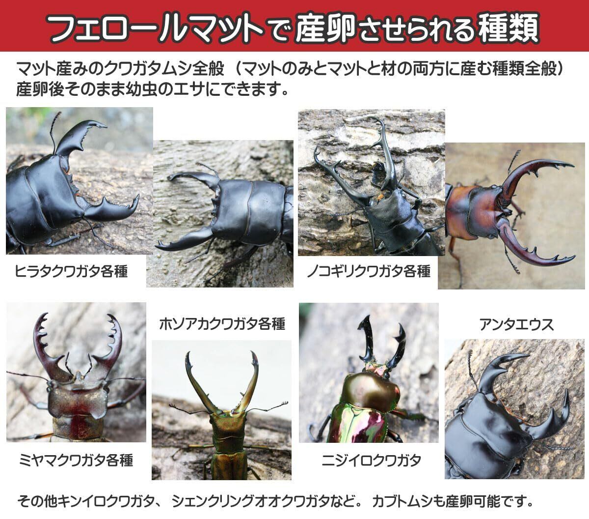 ノコギリクワガタ各種、ヒラタクワガタ各種、ホソアカクワガタ各種、ミヤマクワガタ各種、アンタエウス、国産・外国産カブトムシなどマット産みの種類全般に使用できます。