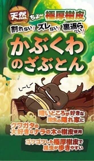 商品名 かぶくわのざぶとん クワガタ・カブトムシ飼育用コルク樹皮(床材・隠れ家・ペアリング用) サイズ・仕様 ・サイズ:7×9cm ・厚み:1.5〜2cm ・素材:天然コルク樹皮 ・適合容器例:コバエシャッター(小・中)、クリアスライダー小、1400ccボトル 商品説明 「かぶくわのざぶとん」は、クワガタ・カブトムシの飼育に最適な、ちょうど良いサイズにカットされた天然コルク樹皮です。転倒防止、隠れ家、ペアリング代など、幅広い用途で使用可能。 天然素材のため、安心して成虫や幼虫の飼育に使用でき、飼育ケースの環境を快適に保ちます。コンパクトなサイズ感で、よく使用される飼育容器にぴったり収まる設計です。 おすすめポイント ・ 天然コルク使用:安全で自然素材、匂いや化学物質の心配なし ・ 隠れ家・転倒防止:成虫や幼虫が安心できる環境を提供 ・ ペアリング代としても使用可能:産卵や繁殖時に便利 ・ ぴったりサイズ:コバエシャッター小・中、クリアスライダー小、1400ccボトルなどに最適 使用方法 1.飼育ケースやボトルにセットするだけで使用可能 2.隠れ家や転倒防止として配置、ペアリング時には代替床材としても活用 3.必要に応じて複数枚を組み合わせてケース内環境を整える 【注意】 ・湿気や水分が多く含まれる状態(尿や霧吹き)が続くと、変色・カビなどが発生する恐れがあります ・破損防止の為箱に入れて梱包しておりますが、若干のかけなどはご了承下さい。