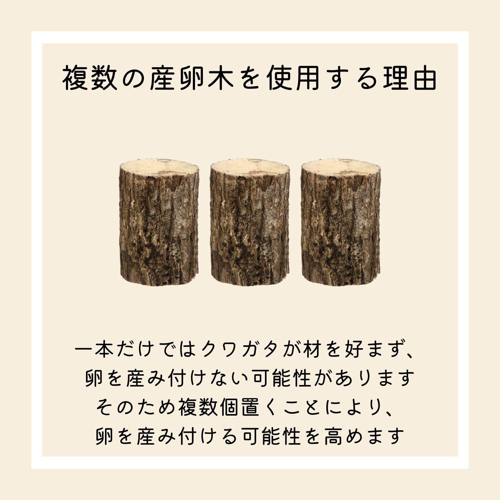 コナラ材:クヌギよりも材質が固めで安価なのが特徴。材が固いと産卵後も崩れにくいため幼虫が2令・3令になってから割り出したい時におすすめです。一般的にはSサイズの産卵木は3本セットします。複数の産卵木を使うのは成功確率を上げるためにとても重要で、メスは自分が気に入った材に産むからです。1本だけだとその材が気に入らなかった場合は産んでくれません。