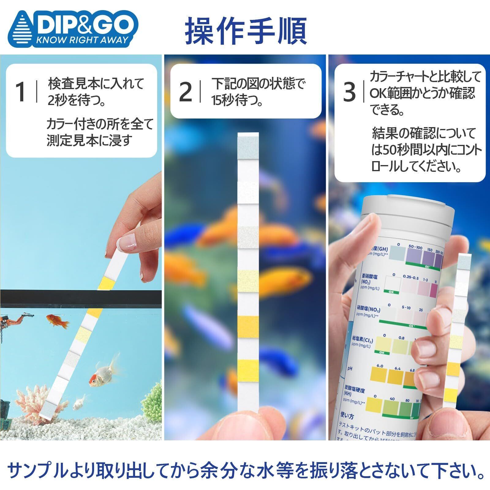 初心者でも安心の水槽の水質の調べ方:誰でもいつでも簡単に3つのステップで検出できる便利な水質検査キットです。①測定サンプルに2秒ディップ、②取り出してから15秒待つ ③カラーチャートと参照して合格かどうか判明できる。明確で正確な水質の結果を取得する。