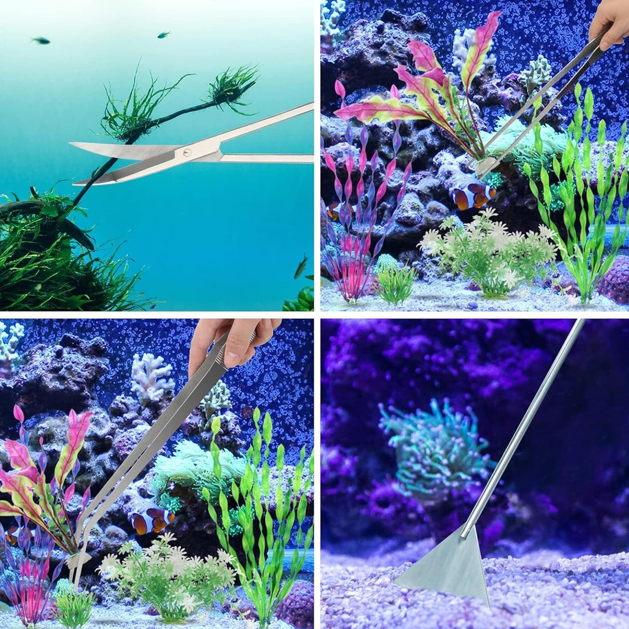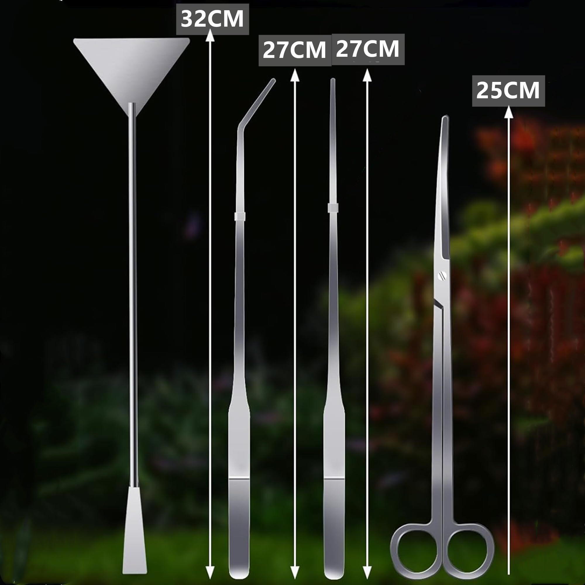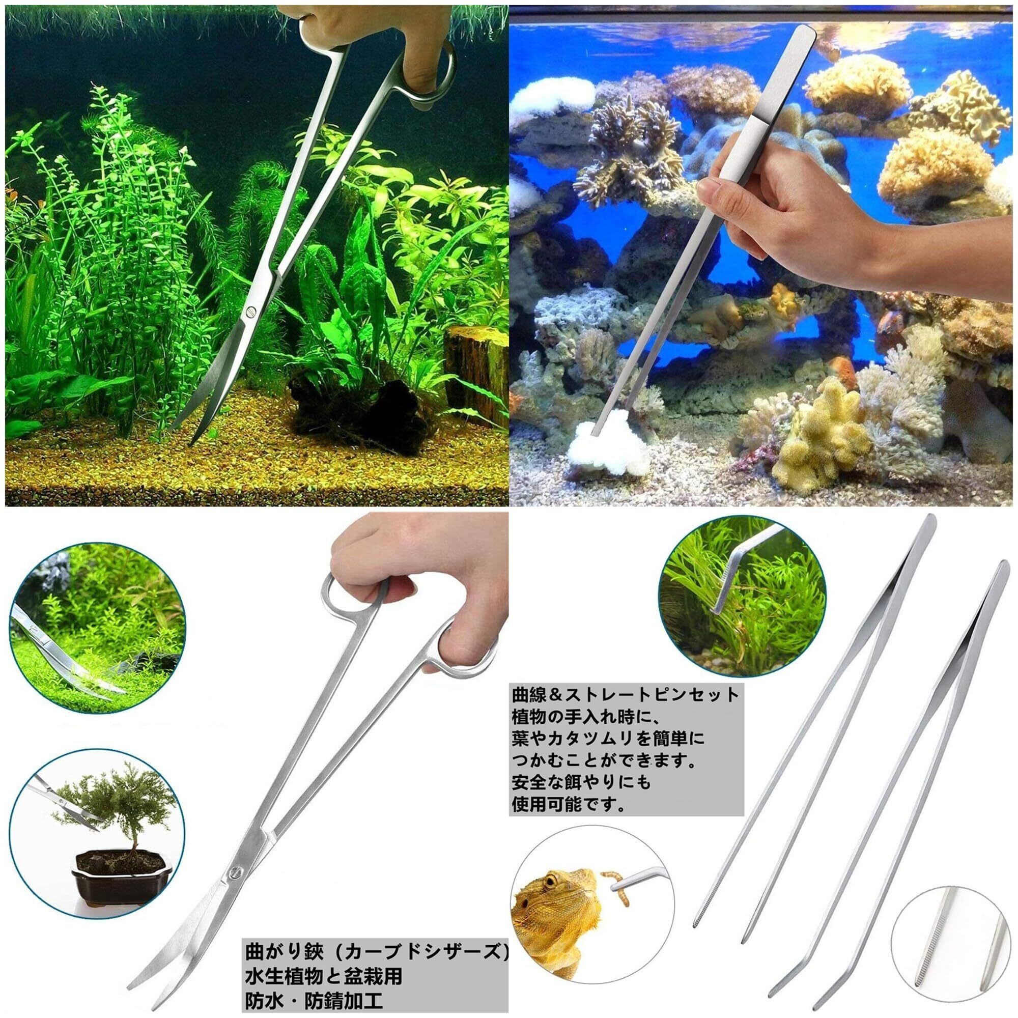 【4点セット】 水草用トリミング4点セット ハサミ(25CM)・ピンセット(27CM)ストレート & カーブ・サンドフラッター(32CM)。