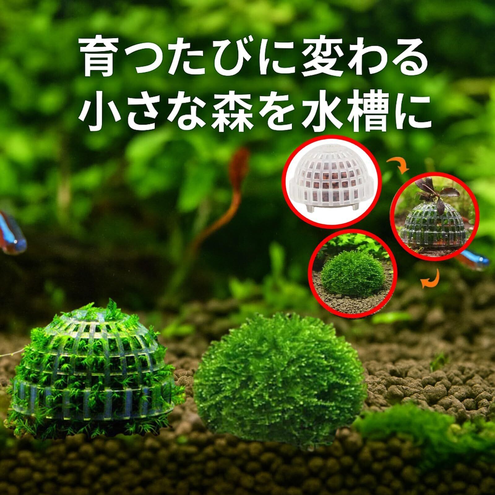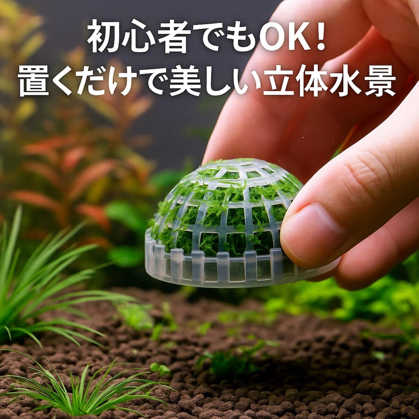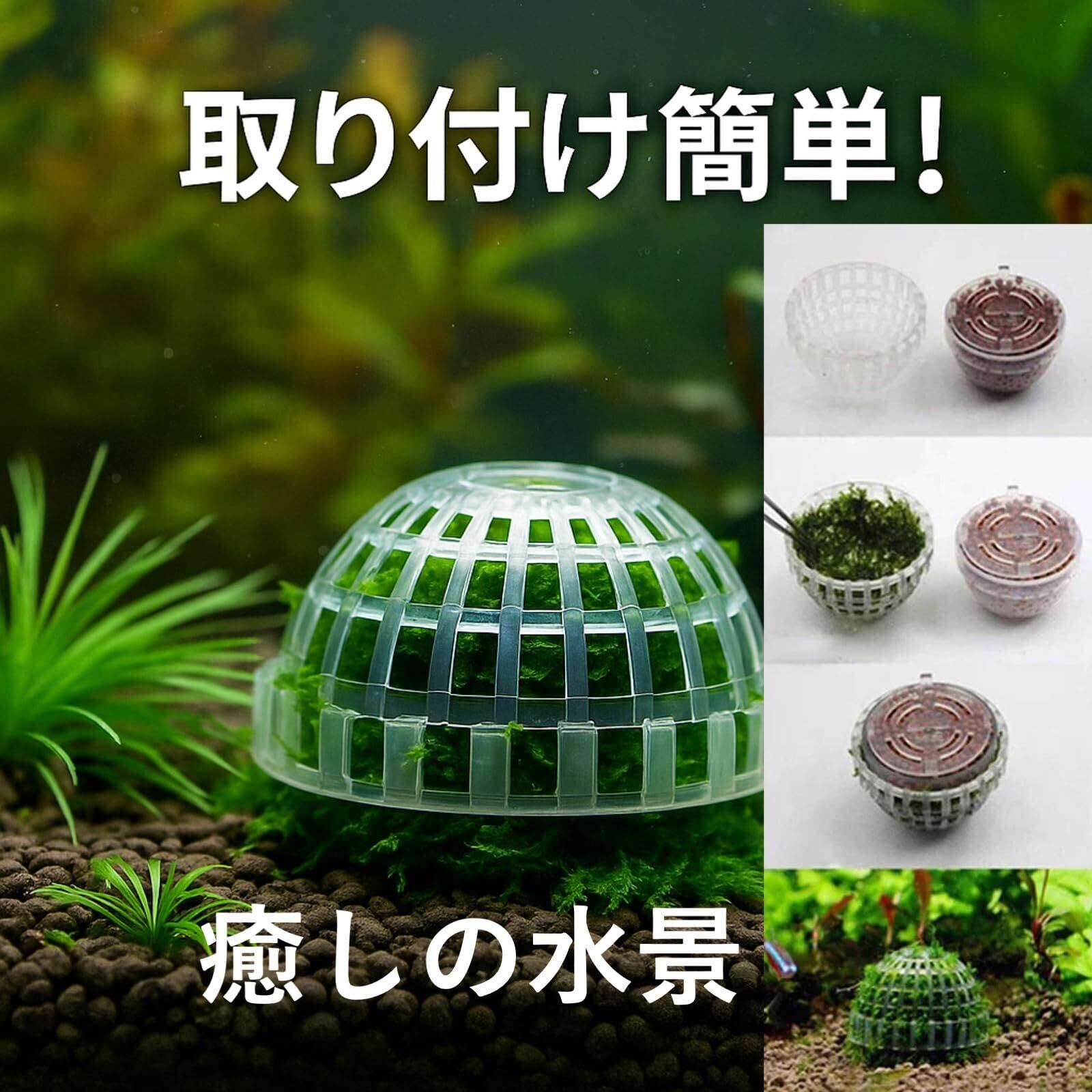 ウイローモスを簡単に固定できるモスドームです。ドーム形状のホルダーにウイローモスを巻き付けるだけで、初心者でも手軽に自然なレイアウトを楽しむことができます。複雑な作業は不要で、設置後すぐに水槽内に癒しのグリーンをプラスできます。やわらかな曲線を描くドーム型デザインとなっておりますので、ウイローモスが成長することで、まるで小さな森のような風景への変化をお楽しみいただくことができます。魚たちの隠れ家にもなり、観賞性と機能性を両立いたします。