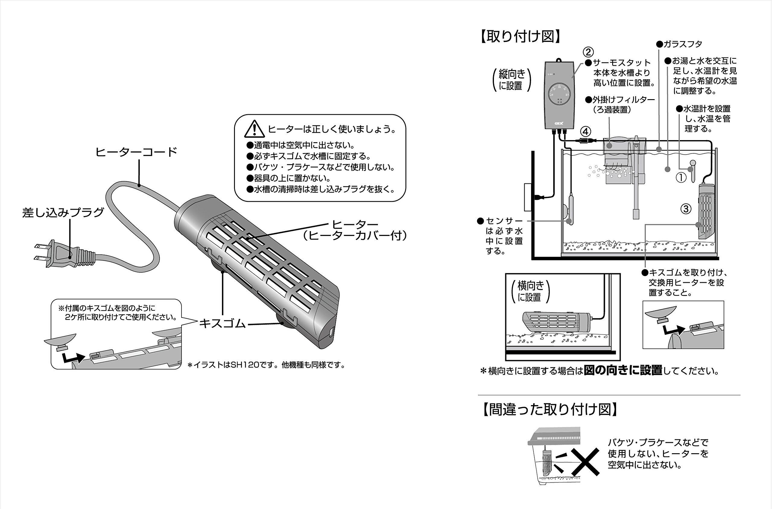 ※本製品は屋内観賞魚飼育専用です。他の目的には使用しないでください。※本製品には水温を下げる能力はありません。※本製品は、直射日光のあたるところや湿気・ほこりの多い所、油煙のあたる所では使用しないでください。※水温の管理には、必ず水温計を併用してチェックしてください。※エアレーションまたは、ろ過装置を使用し水槽内の水が撹拌されている状態の水槽で使用してください。※適合水槽サイズは周囲温度が15度以上の環境の場合です。15度に満たない場合は希望水温にならない場合がありますので注意してください。 ※ヒーターは消耗品です。1年間のご使用を目安に交換してください。