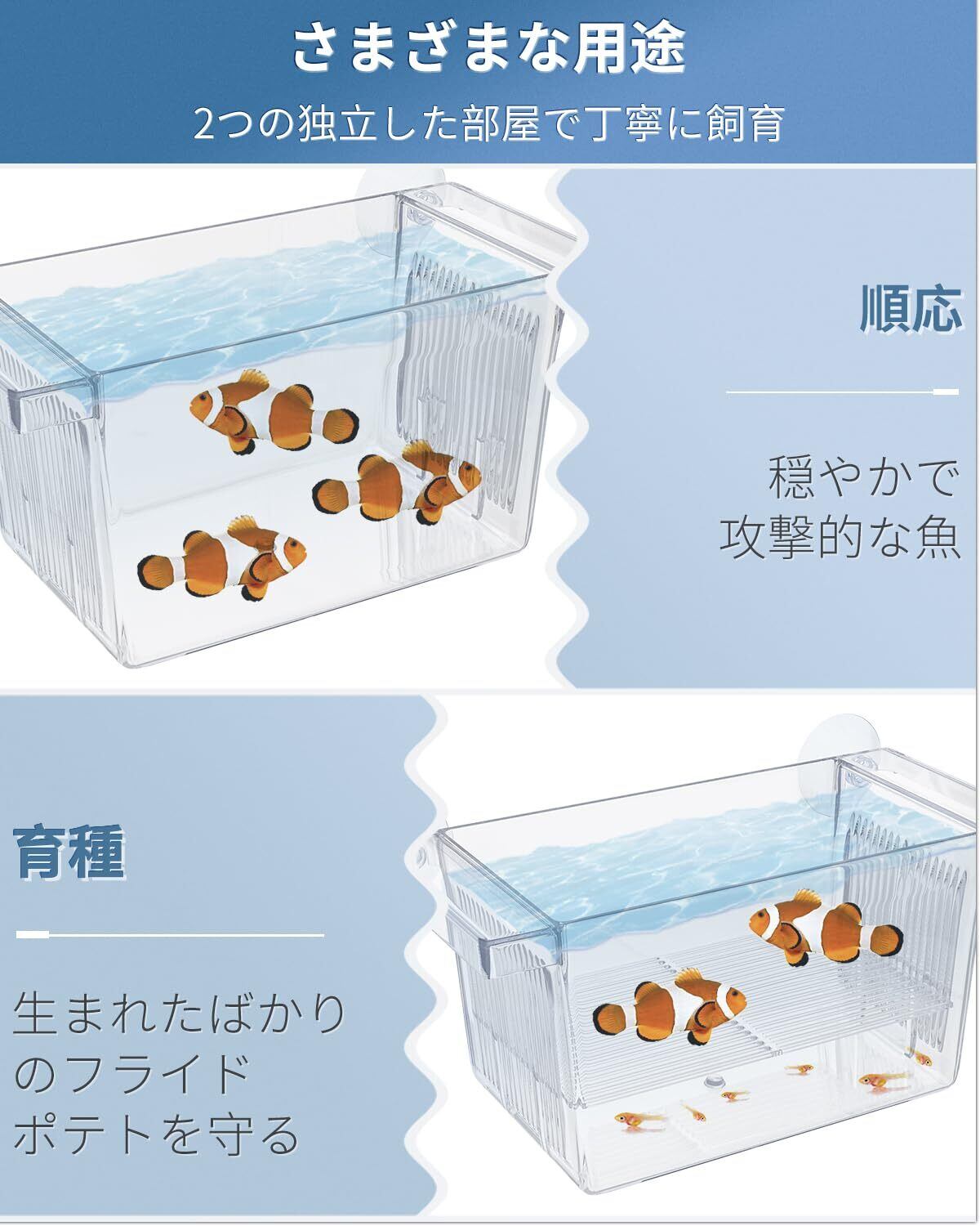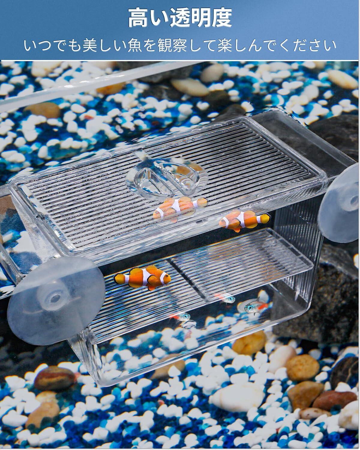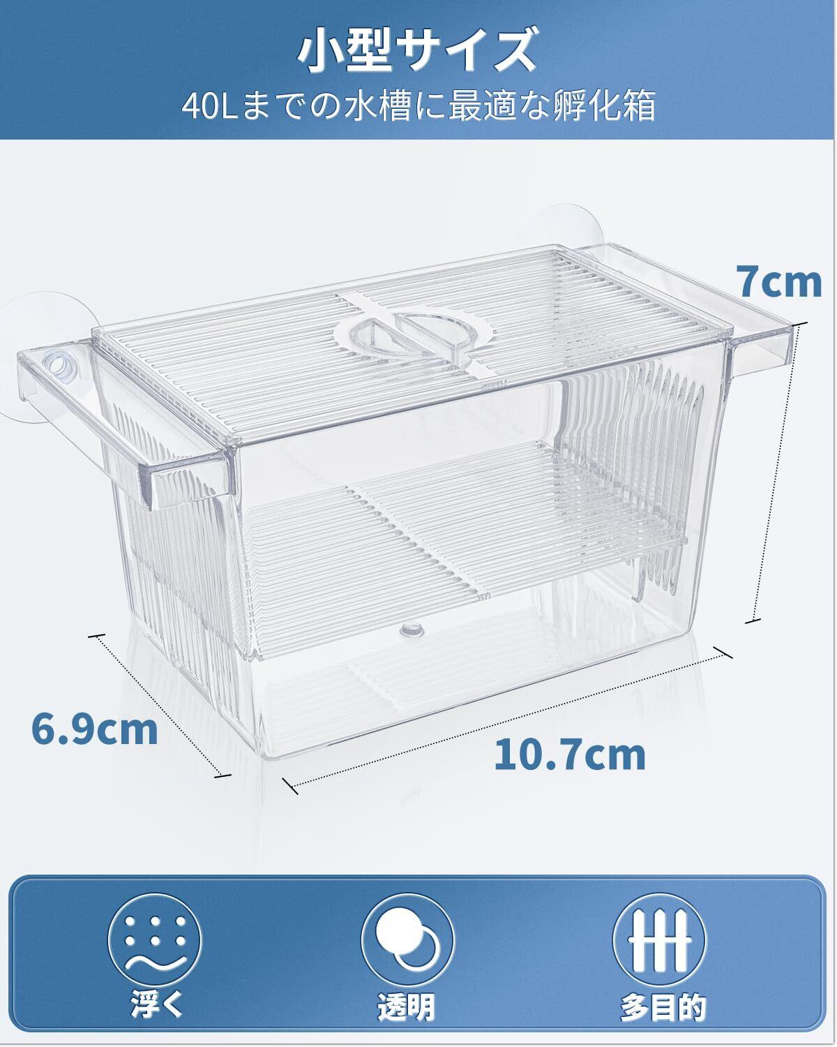 小さな孵化箱:長さ10.7×幅6.9×高さ7(cm)の内寸で、生まれたばかりの稚魚が食べられたり襲われたりするのを防ぎます。小さな魚やエビの餌に適しています。