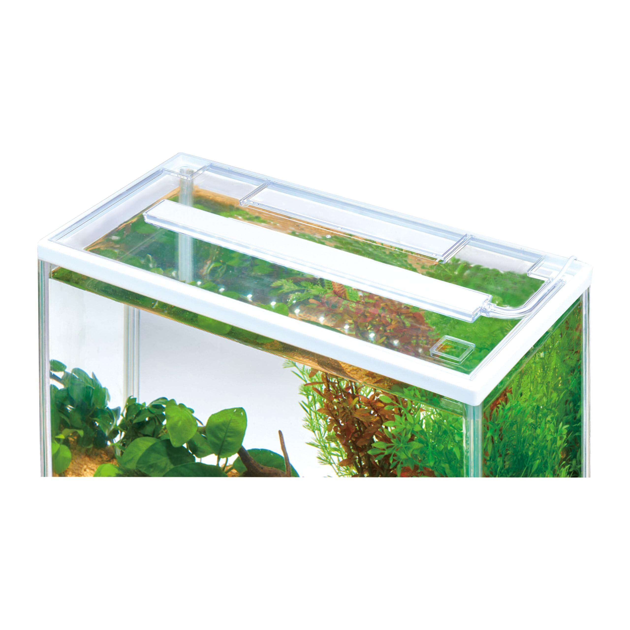お部屋のインテリアに合わせやすいホワイトフレームの水槽とフタのセット。 「クリアLEDフラッティ3040(別売)」がピッタリなアクアカバー付き。