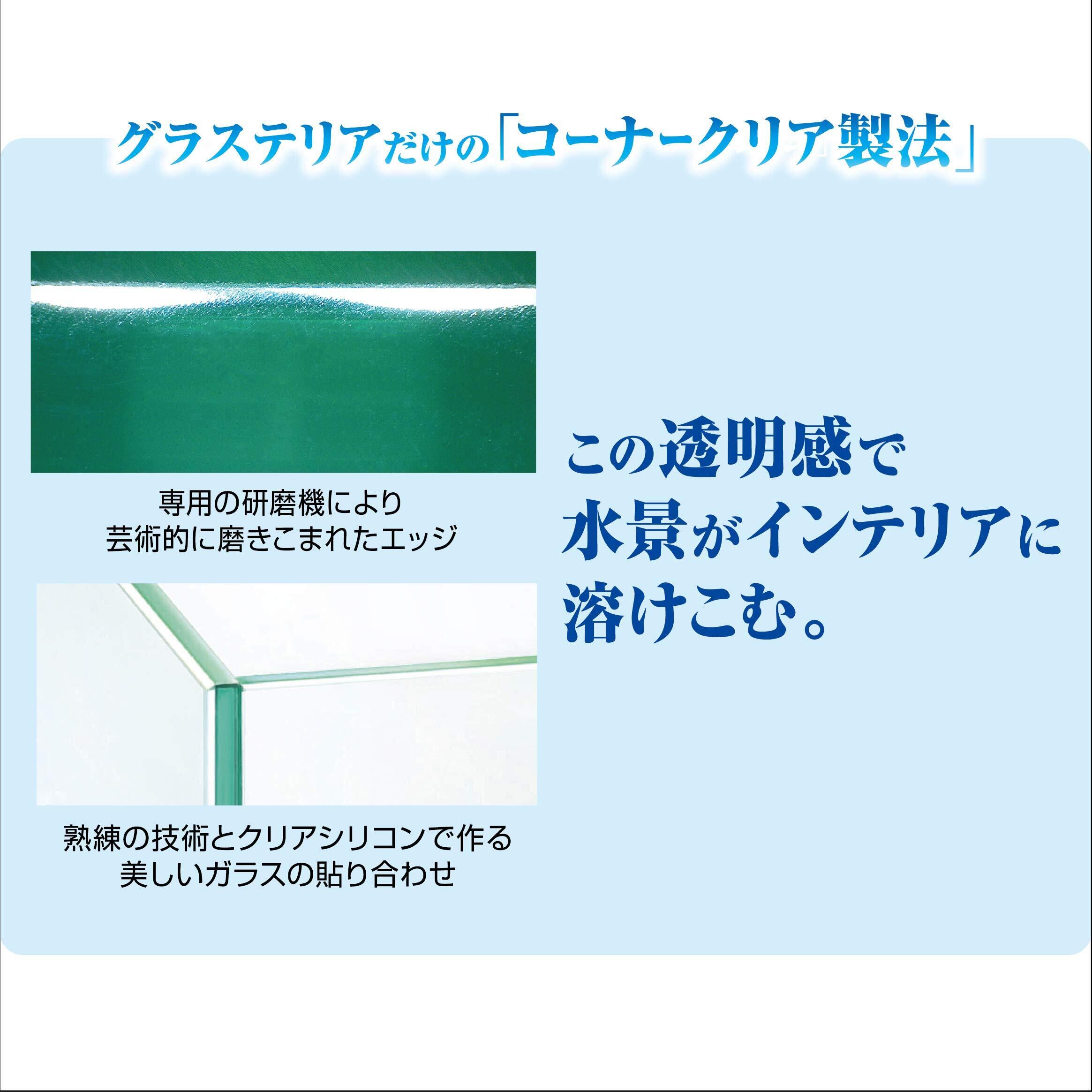 ※本製品は屋内観賞魚飼育専用です。他の目的には使用しないでください。※テレビ、ステレオ、パソコンなど電気製品の上や近くに置かないでください。※設置場所は十分な耐荷重強度のある平坦で安定した場所を選んでください。※生体の種類や組合せによって、飼育方法や飼育できる匹数、セット内容以外に必要な飼育用器具が異なります。詳しくは、生体をお求めになられた専門店などにご相談ください。