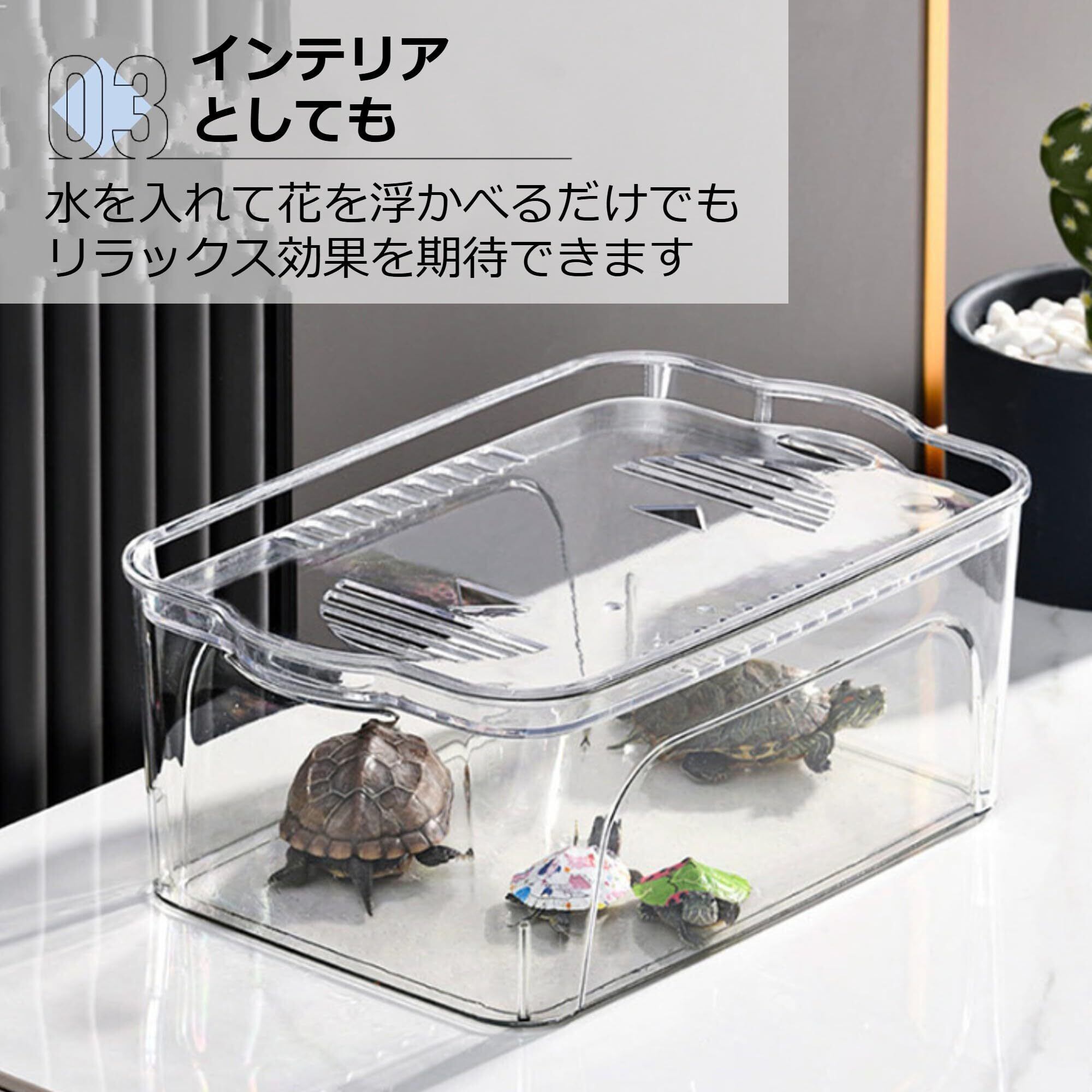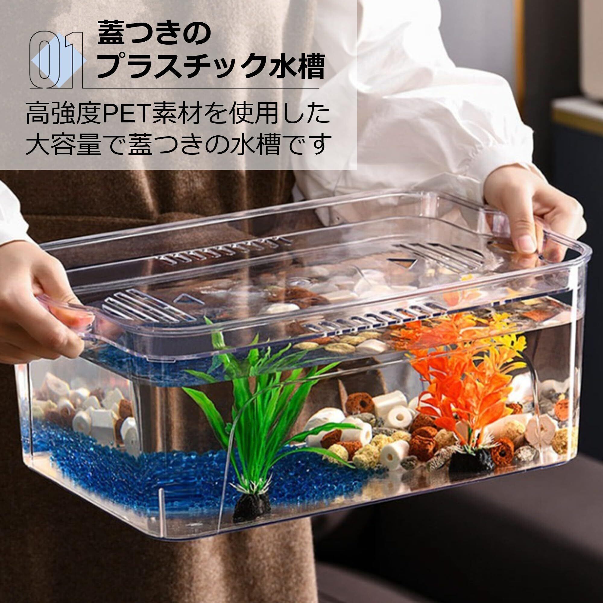 【蓋つきのプラスチック水槽】高強度PET素材を使用した大容量で蓋つきの水槽です。メダカや金魚、エビなど水生生物の観賞用にご使用ください。