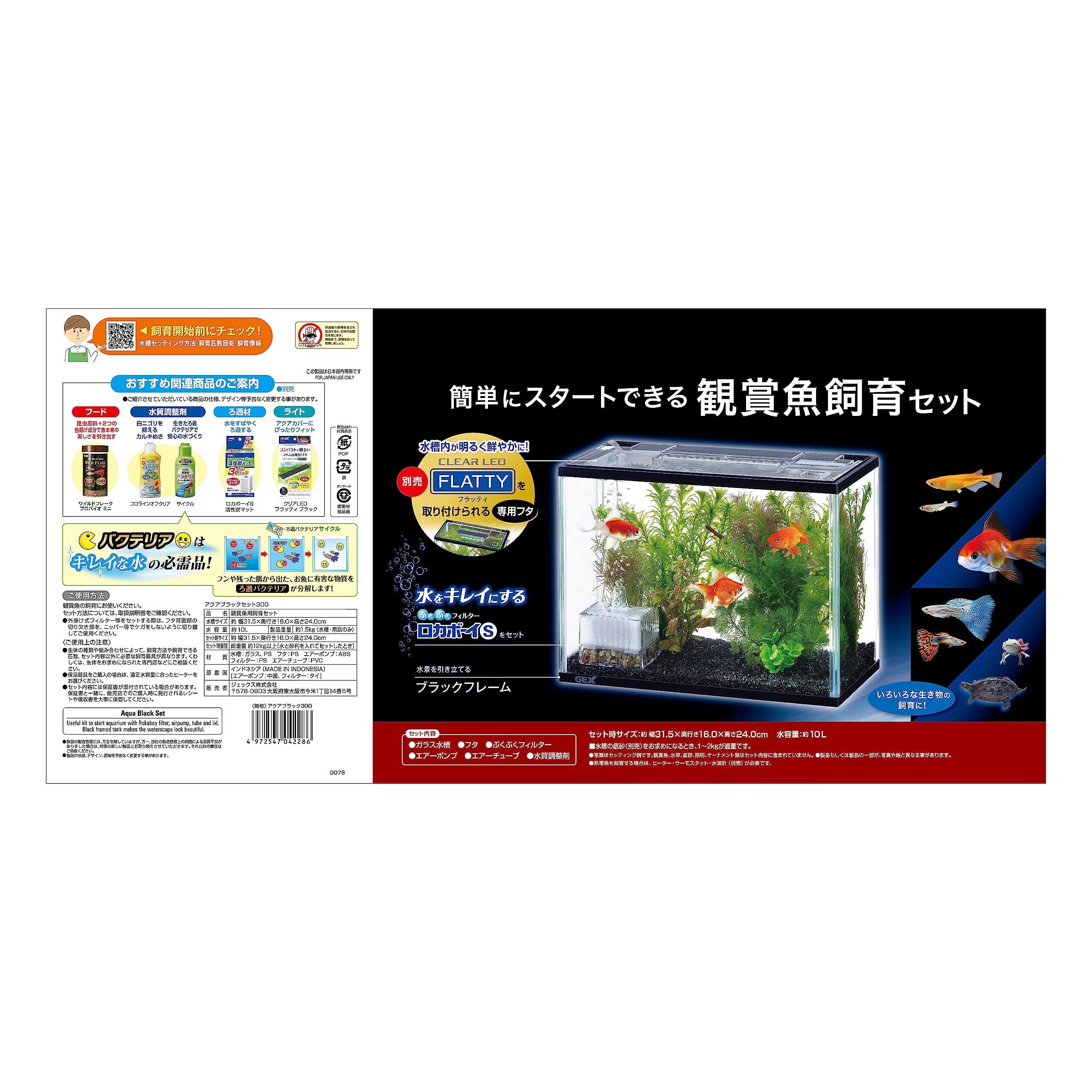 観賞魚や色々な生き物の飼育を簡単にスタートできるセット。 別売「クリアLED FLATTY(フラッティ)」をすっきり取り付けられる専用フタ付き。 水をキレイにするぶくぶくフィルターロカボーイSをセット。 水景を引き立てる ブラックフレーム。 いろいろな生き物の飼育に!