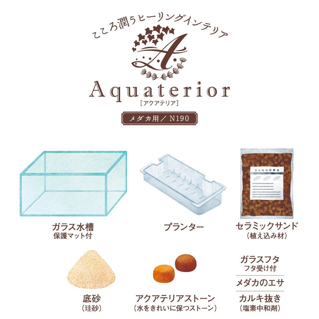 セット内容:ガラス水槽、専用プランター(セパレート)、セラミックサンド(植え込み材)、珪砂(底砂)、アクアテリアストーン、カルキ抜き(塩素中和剤)、メダカのエサ、水槽おそうじ手袋/みずものコム限定(カラーはクリアまたはブルー)