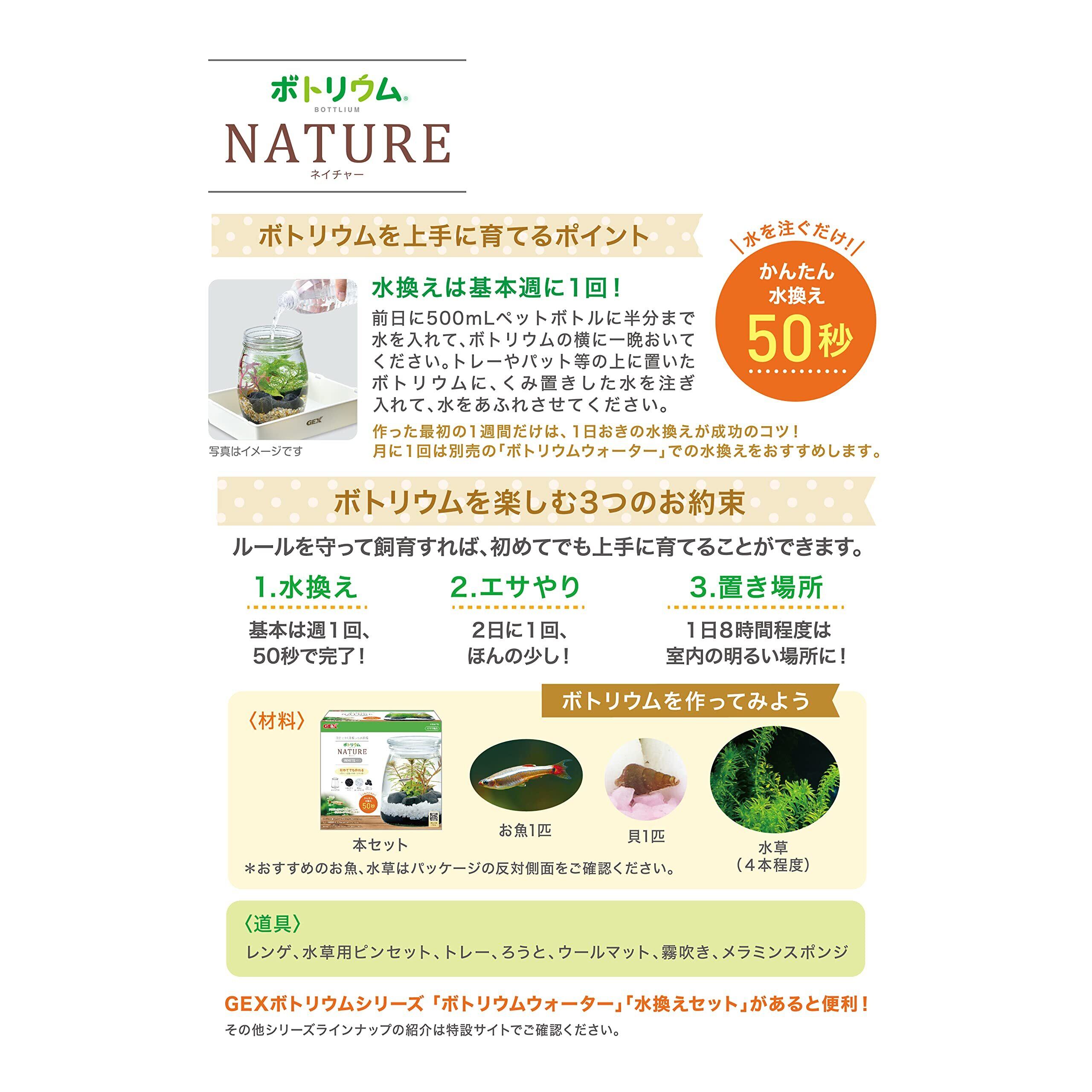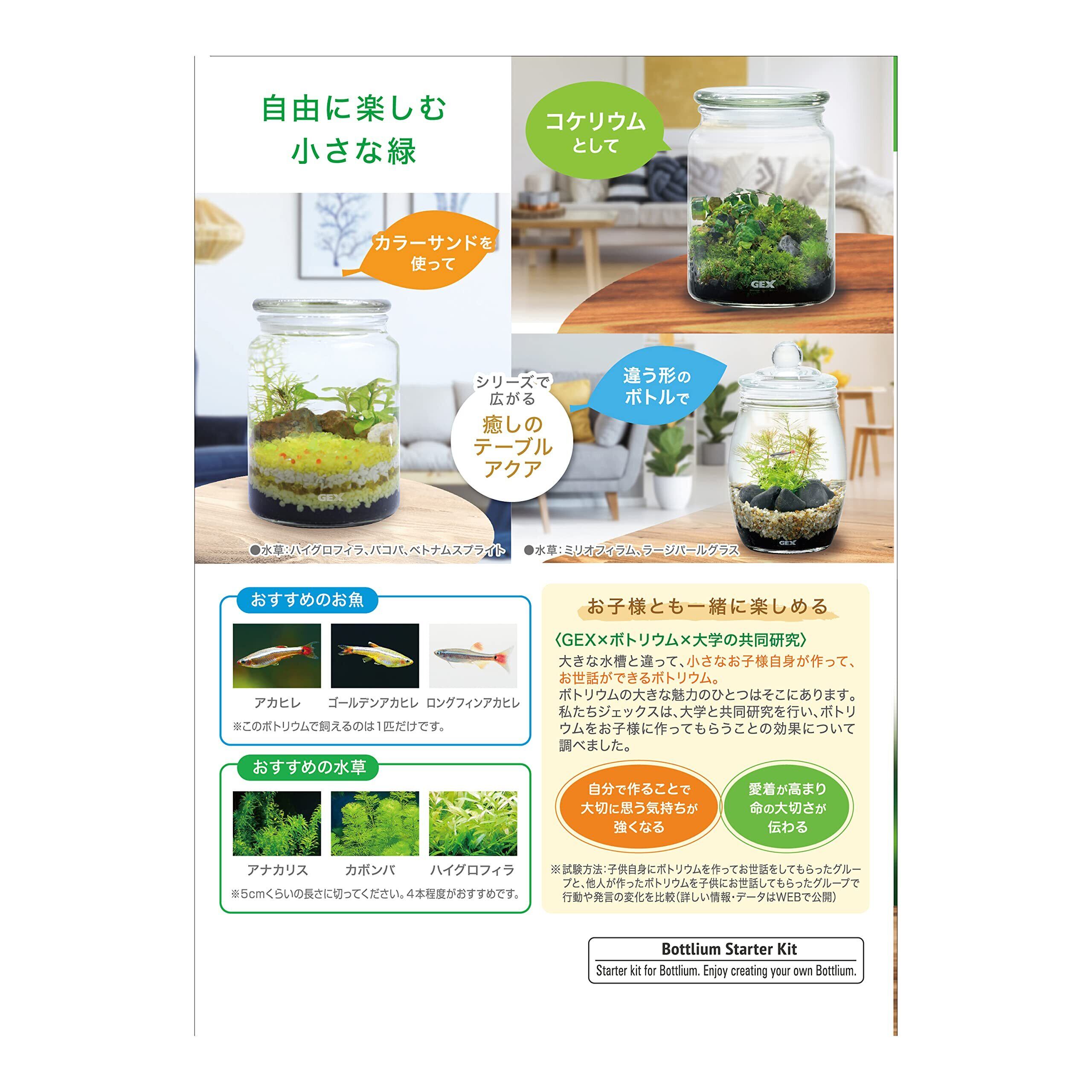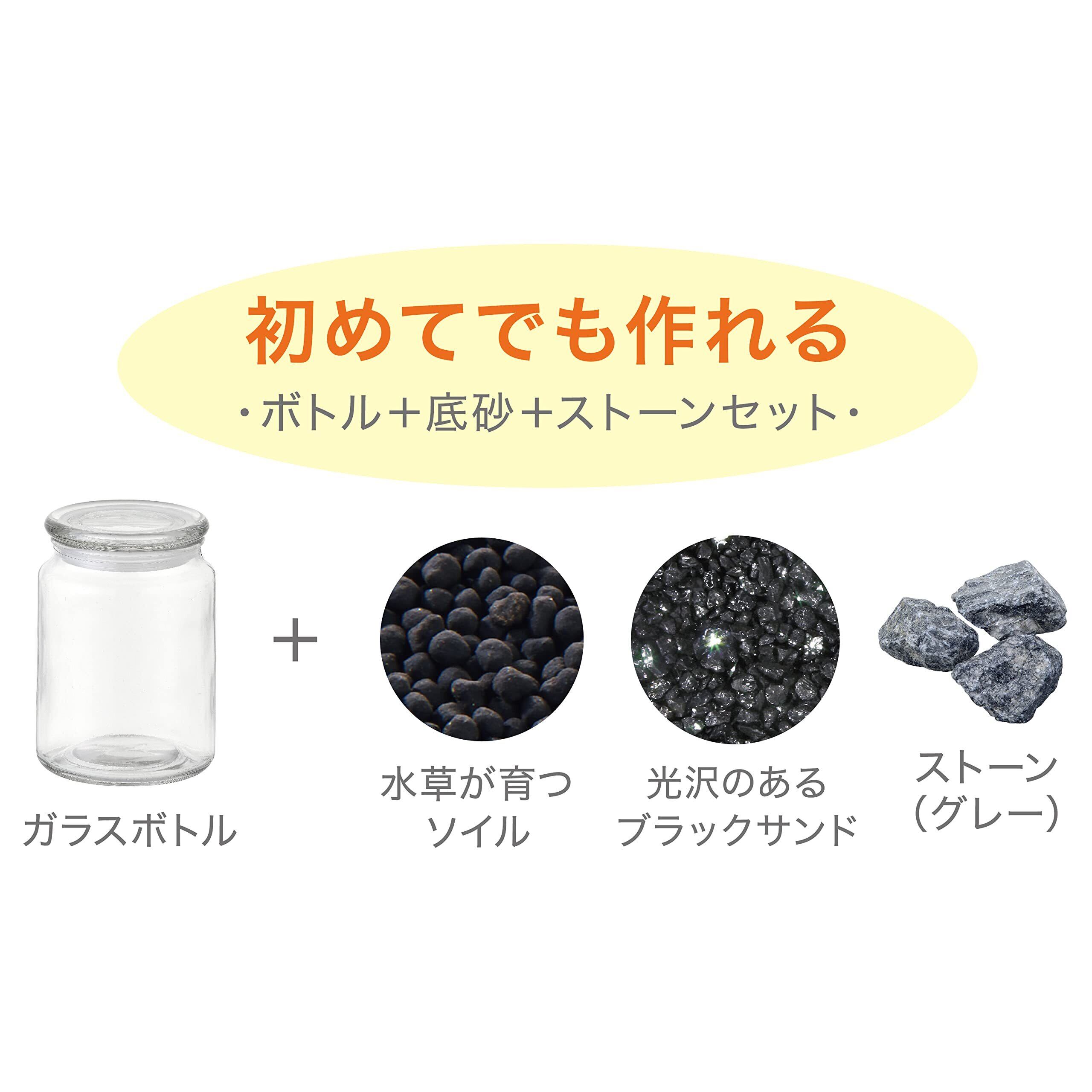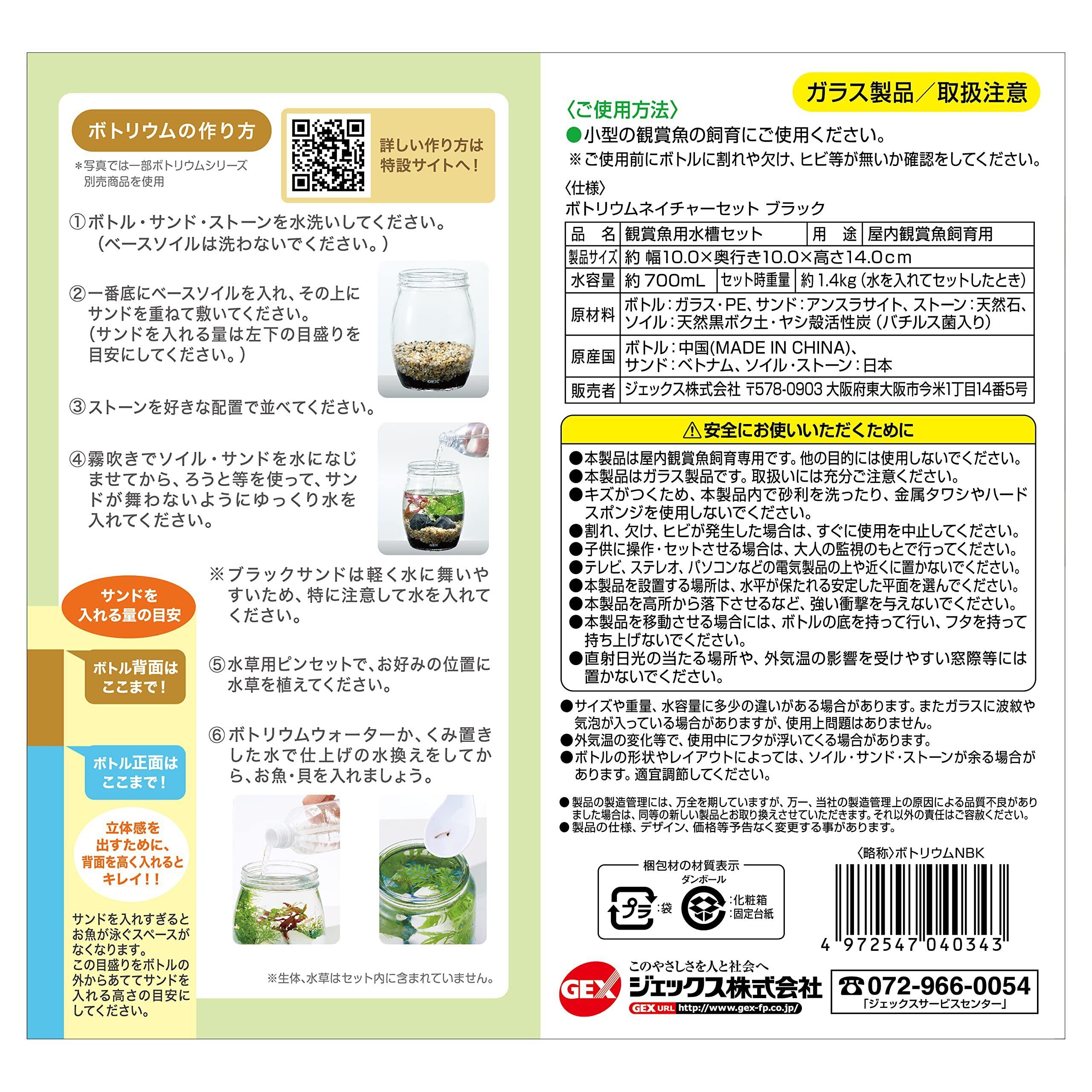 自分でつくる癒しの水族館 初めてでも作れる ガラスボトル+水草が育つソイル+ナチュラルなブラウンサンド+ストーン(ブラック)のセット 水を注ぐだけかんたん水換え50秒 アカヒレのワンルームマンションや、水草のレイアウトが楽しめる! コケリウムやレイアウトを楽しんでテーブルアクアとして。 【お子様とも一緒に楽しめる】大きな水槽と違って、小さなお子様自身が作って、お世話ができるボトリウム。ボトリウムの大きな魅力の一つはそこにあります。私たちジェックスは、大学と共同研究を行い、ボトリウムをお子様に作ってもらうことの効果調べました。 「自分でつくることで大切に思う気持ちが強くなる。」 「愛着が高まり命の大切さが伝わる」 <ボトリウムの作り方> 1.ボトル・サンド・ストーンを水洗いしてください。(ベースソイルは洗わないでください。) 2.一番底にベースソイルを入れ、その上にサンドを重ねて敷いてください。 3.ストーンを好きな配置で並べてください。 4.霧吹きでソイル・サンドを水になじませてから、ろうと等を使って、サンドが舞わないようにゆっくり水を入れてください。 5.水草用ピンセットで、お好みの位置に水草を植えてください。 6.ボトリウムウォーターか、くみ置きした水で仕上げの水換えをしてから、お魚・貝を入れましょう。 水槽サイズ:約W10.0×D10.0×H14.0cm 水槽水容量:約700mL セット内容:ガラスボトル、水草が育つソイル、光沢のあるブラックサンド、ストーン(グレー)