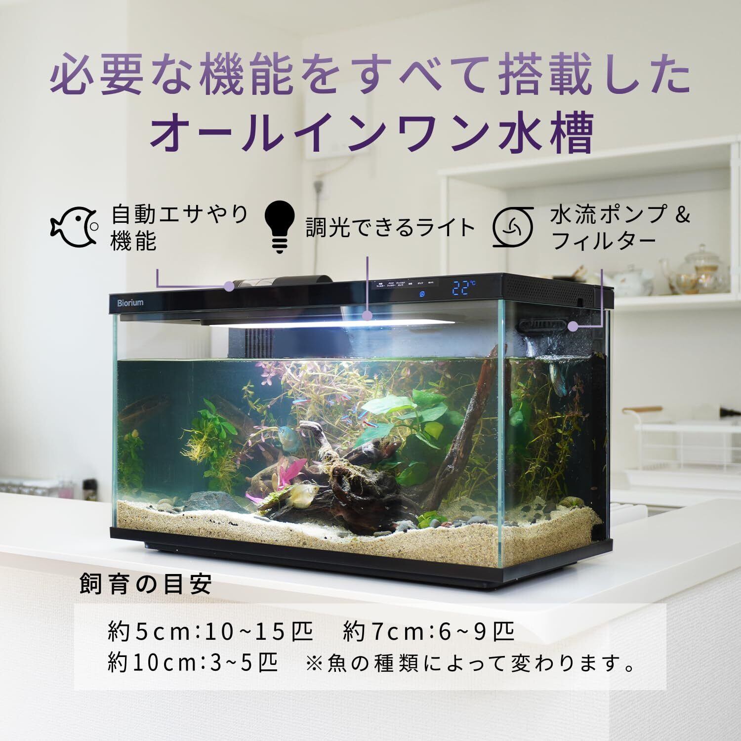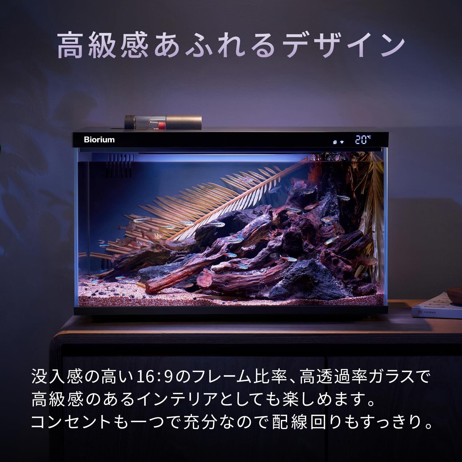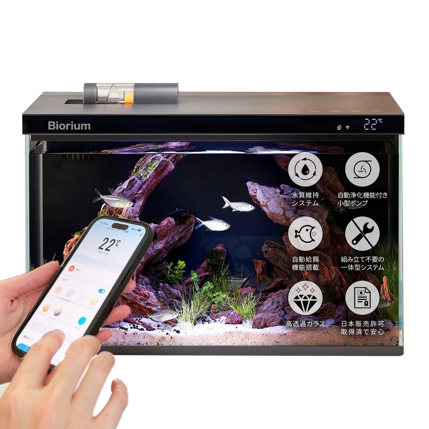 Biorium IoT搭載 スマート水槽 オールインワン 45cm 1年付き クリアガラス 自動給餌機 オートフィーダー フィルター 濾過槽 ポンプ 20L 初心者 簡単 Smart Aquarium
