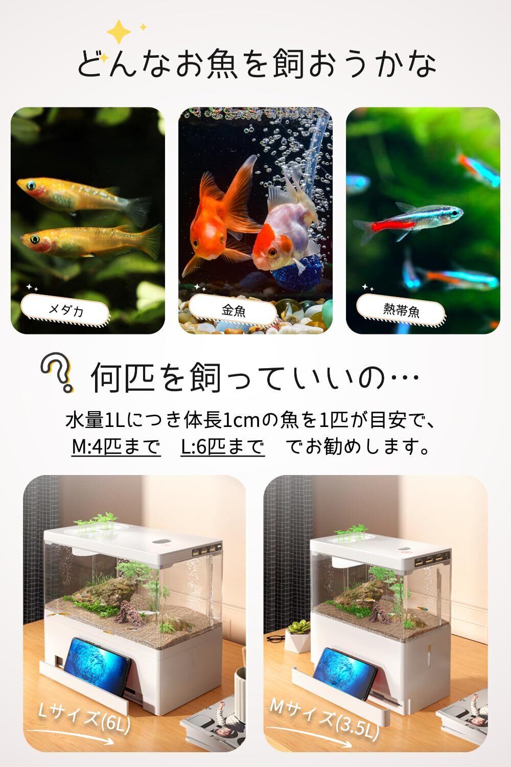 【仕様について】本体寸法:M(約)22×19×10cm L(約)27×24×15cm。水容量:M(約)3.5L L(約)6L。LEDライト:3色で無段階明るさ調節。セット内容:水槽セット×1、日本語説明書×1。
