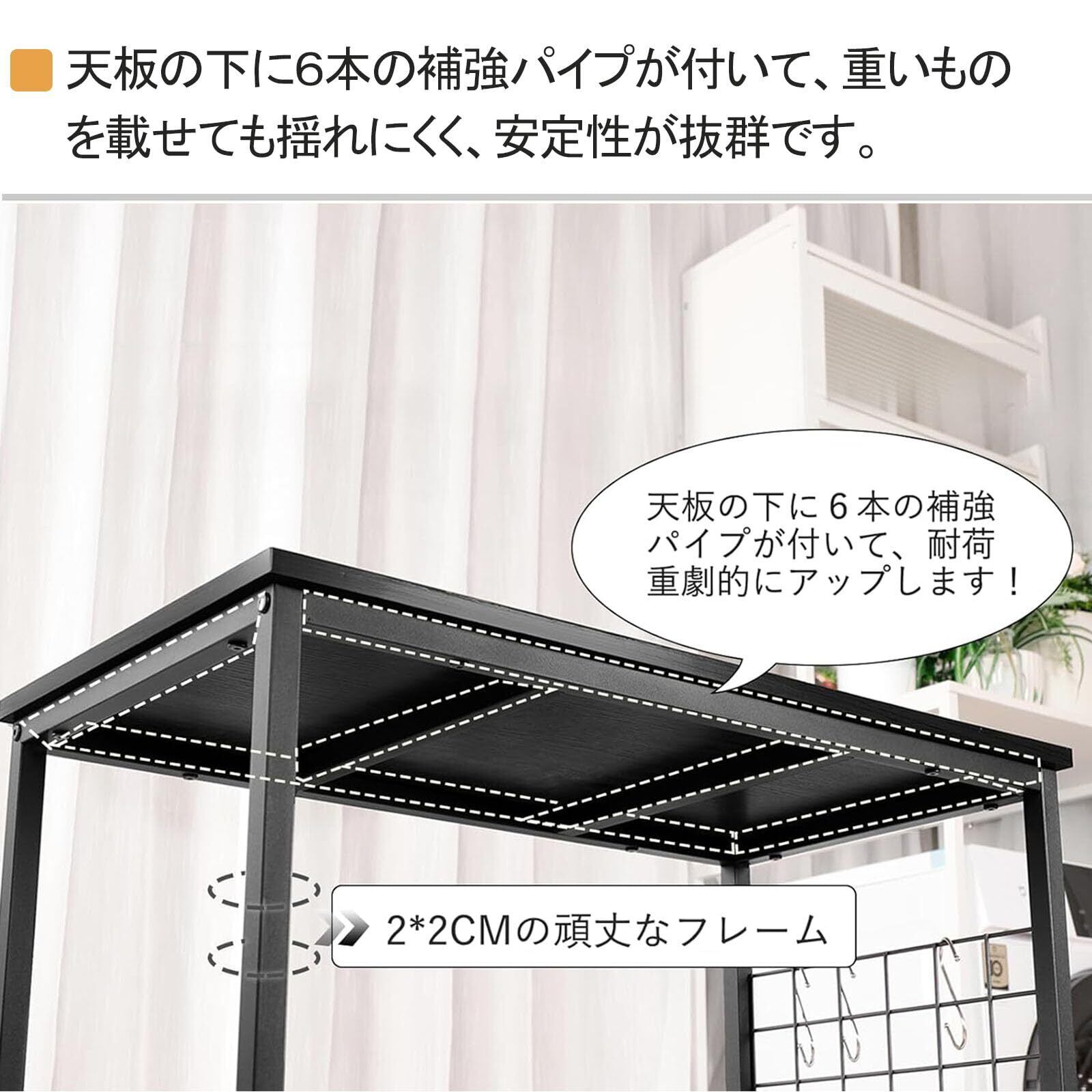 【頑丈な構造、優れた耐久性】棚板の厚さは1.5cmの丈夫なボードを使用し、優れた耐荷重性能を持ち、重い水槽やプリンターなどを置いても変形しません。フレームは2cm×2cmのスチール製で、錆びにくく、耐久性が高いです。また、天板の下には6本の補強管があり、重い物を載せても揺れにくく、安定性が非常に優れています。