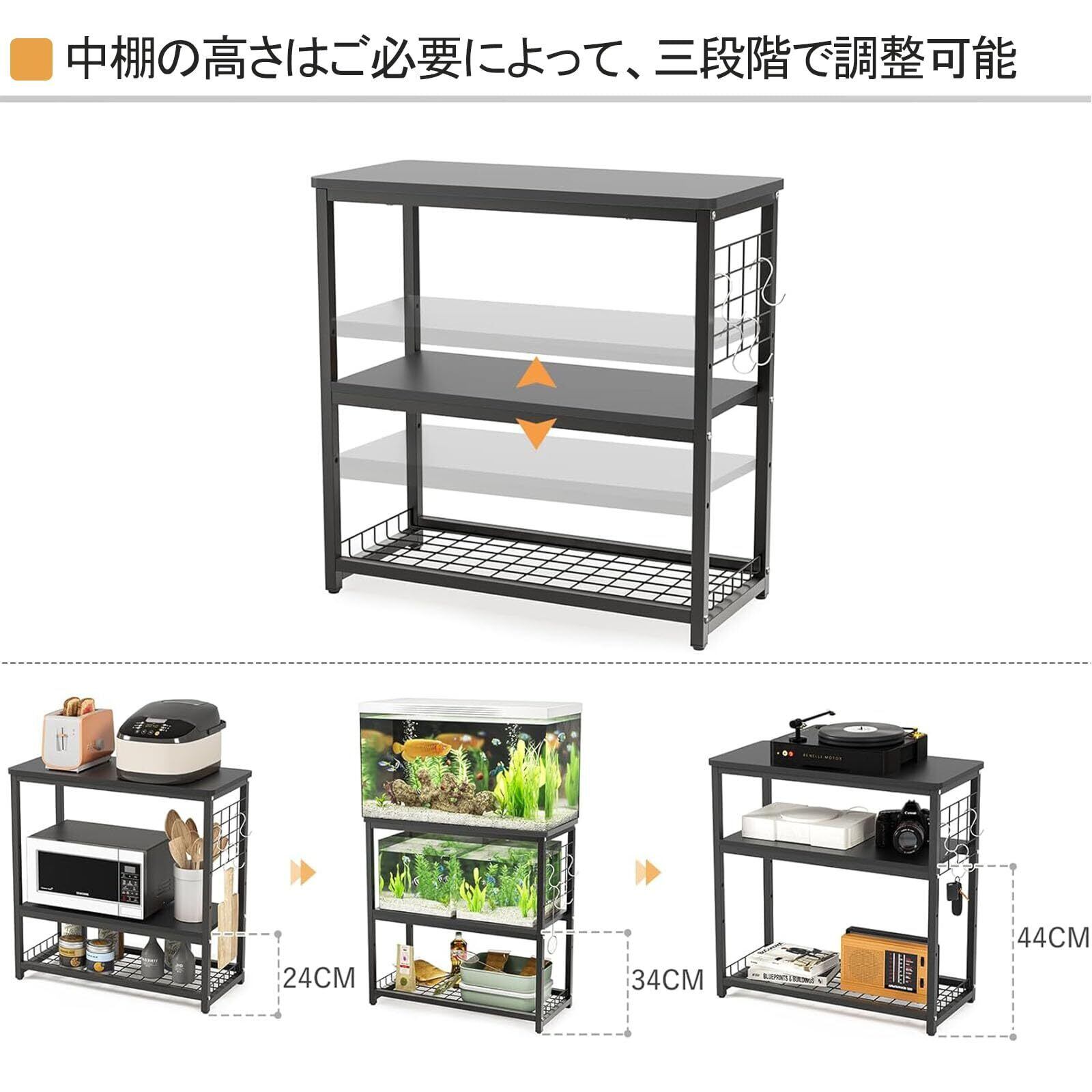 【優れた収納スペース】こちらは3段の収納ラックです。➤幅65cm、奥行30cmの天板は、最大100kgまで耐えられます!同じサイズの水槽をしっかり収納できます。➤中棚の耐荷重は50kgで、3段階で調整可能です。➤底棚の耐荷重は5kgで、網目状のデザインは通気性が良く、乾いた布などを収納するのに適しています。このラックは、オフィス、リビングルーム、寝室、キッチンなど、さまざまな場所で使用できます。
